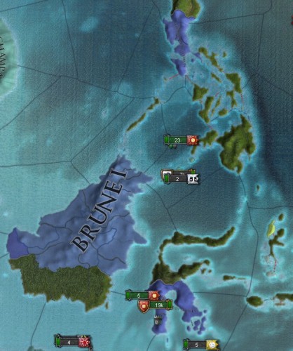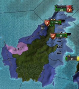 次こそは実入りの多い戦いをと、貞心が目を付けたのはボルネオ島でした。島の南部にはすでに朝鮮が入植を始めていましたが、以前から発展していた北部諸州はブルネイが統一し、東南アジア交易の要地として栄えていました(首都BruneiのDev22)。
