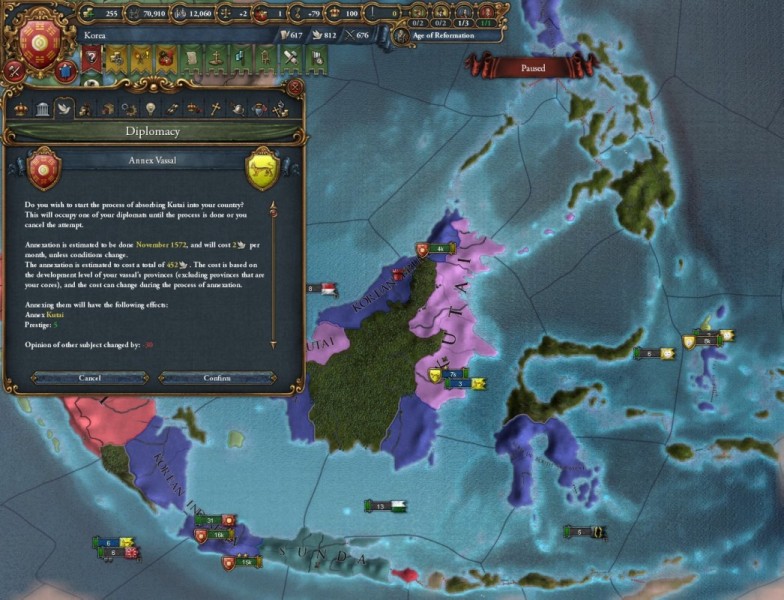 朝鮮は西岸の豊かな2州と457Dの賠償金を得るとともに、ブルネイに滅ぼされていたクタイ王国を復活させ、将来の東部侵攻への足掛かりを築きました。
