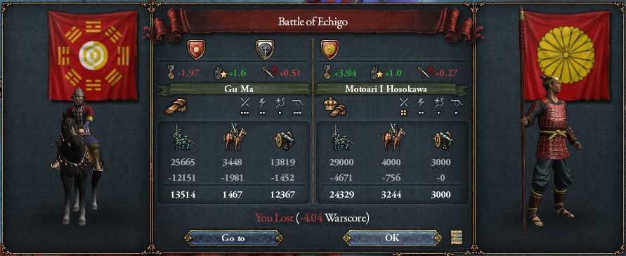 1518年、貞心は細川幕府の傘下にあった小笠原氏に宣戦します。Nipponトレードノードにおける影響力の増大を狙った侵攻でしたが、戦乱の中で鍛えられた大名達の軍勢は想像以上に頑強な抵抗を示します。4年にわたる戦いの末に朝鮮は3州を奪いますが、多数の傭兵を補充せざるを得なかった朝鮮の財政は一時的に悪化しました。占領地にこれ以上兵を割くことを嫌った貞心は、上杉氏の末裔にこの3州を与えて統治をゆだねました。