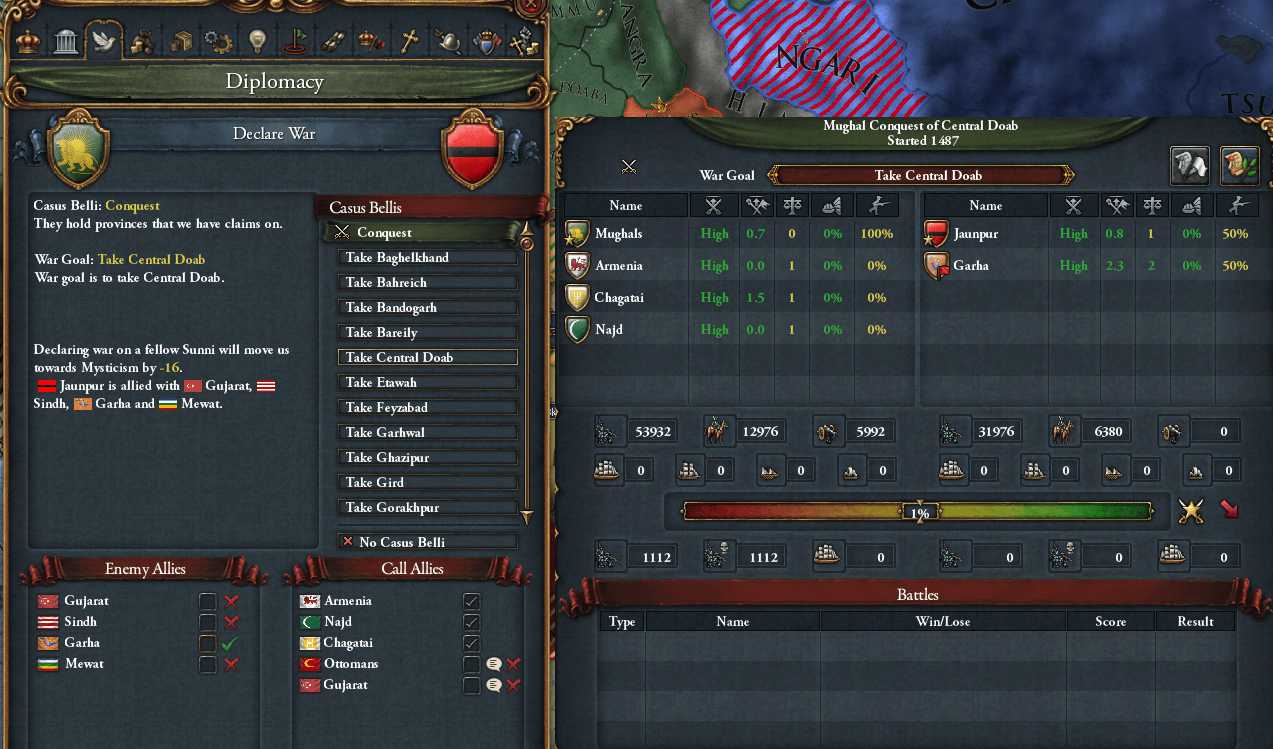 ミッション進行の都合上Jaunpurと開戦したかったが、Mughalsの同盟Gujaratと同盟していたので