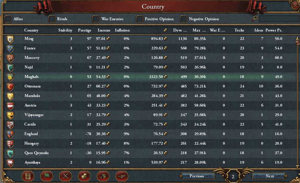 Najdを除けばいつものメンバー。最近自国がおかしな挙動をする世界線ばかりに浸かっているせいか、順当過ぎて逆に珍しく感じる。 Najd以外の従属国はAragon(Castileの同君下位) 2番目のアイデアは"統治"を選択。ポリシーの外交併合コスト削減狙い。Mughalsの伝統(1回目の変態時はNIを変更している)もあり、 統治アイデア②取得後はコア化コストが格安で済んだ。特に恒久的請求権のついた州を獲得した場合は統治効率0%にも関わらず"必要ADM=DEV値"だった