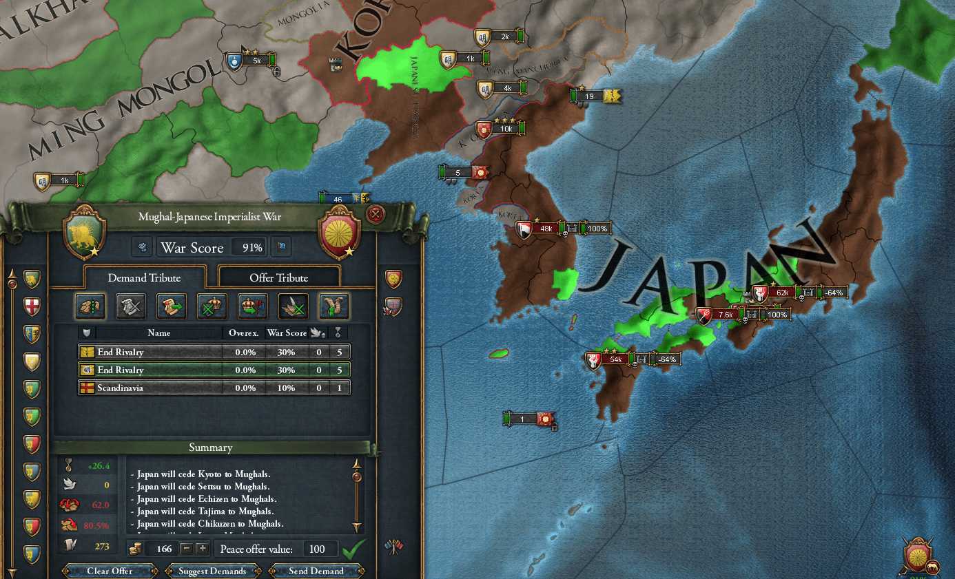 イベリア文化グループ同化ボーナスは終盤の空地埋め時に役立ってくれることだろう 植民地国家×8も引き継ぎ 今まで植民お疲れ様、君の育てた植民地は責任を持ってMughalsが活用します。 自陣営の犠牲の半分強はMughalsのもの。本国は大したことなかったが、とにかく植民地国家軍が多かった 有り余る資金で傭兵を雇ったため人的資源はむしろ増えたが、次回アプデで傭兵の仕様が変わるらしいので少し不安