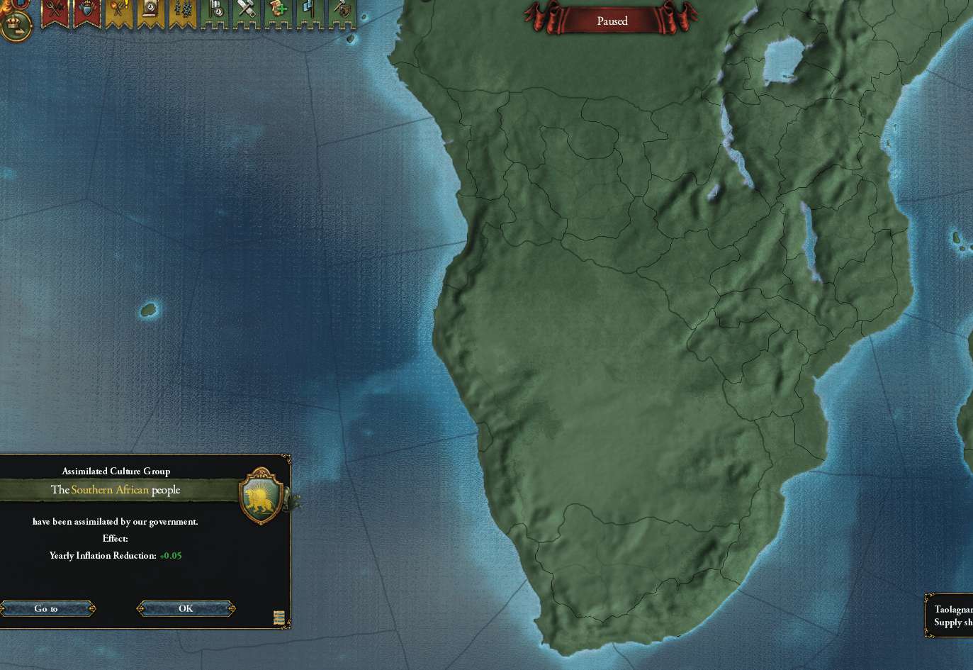 良く考えずにクリックしてしまった。 1州でも下賜(恐らく戦争で失っても同じ)してしまうと、文化グループの同化ボーナスは失われるが 一度同化した文化(今回はカステーリャ文化)が未同化に戻ったりはしない