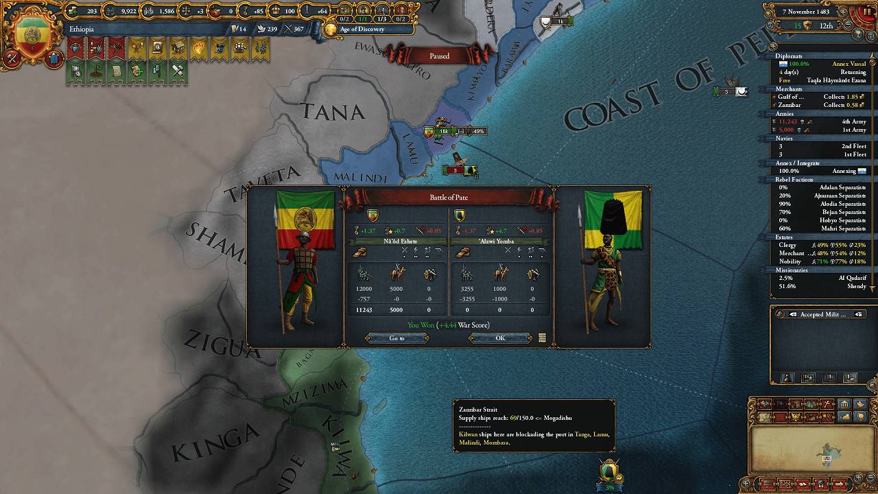 野戦でMombasa軍を全滅させたため、すぐ優勢に