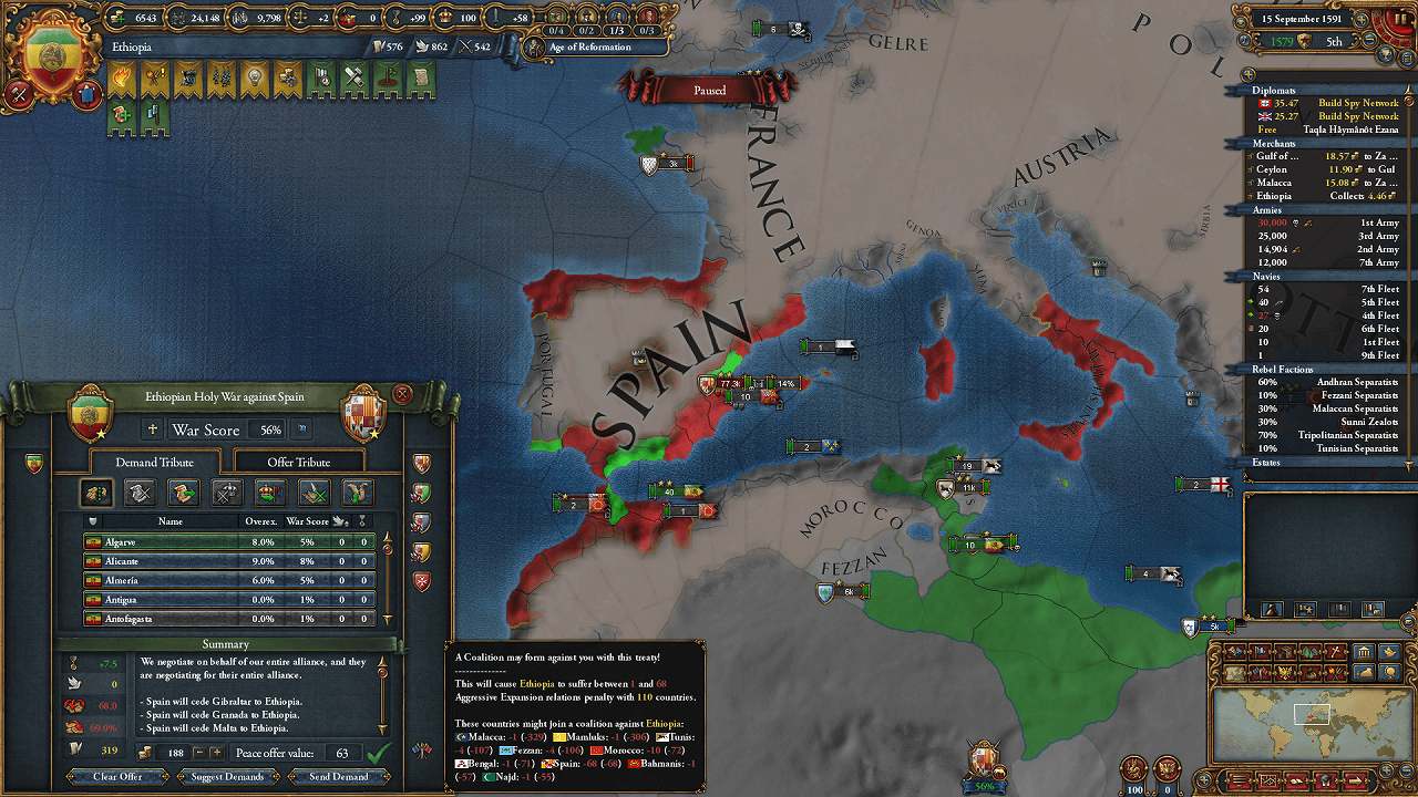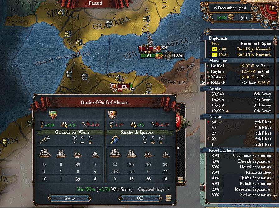 Ottomansが降りたので終戦。ジブラルタル海峡の両岸とAragon、Naplesの種地を獲得