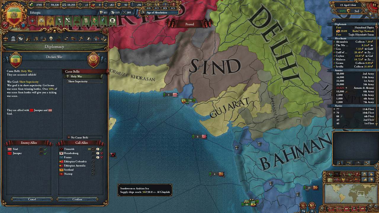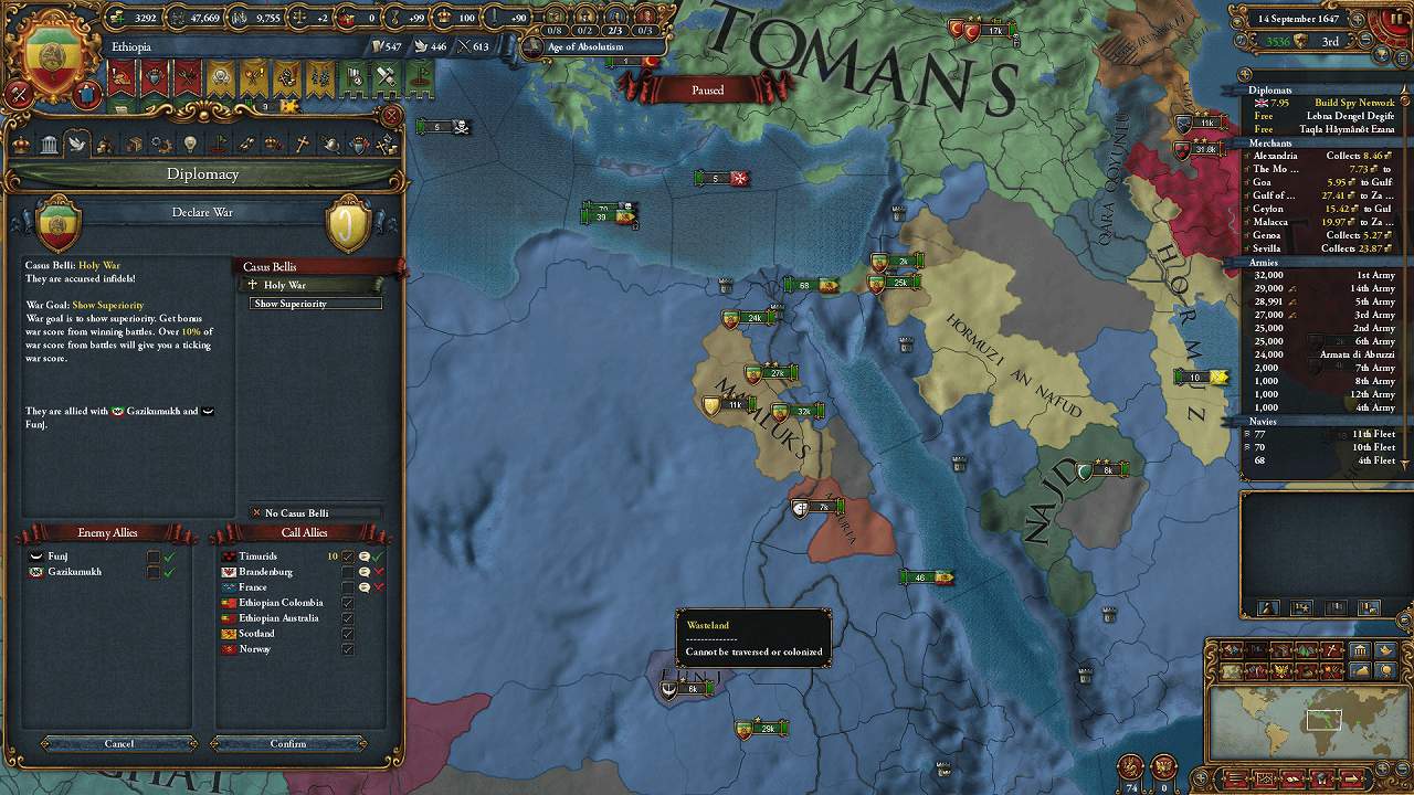 (Ottomansに宣戦の場合、TimuridsとBrandenburgがビビッて召集に応じてくれなかった)