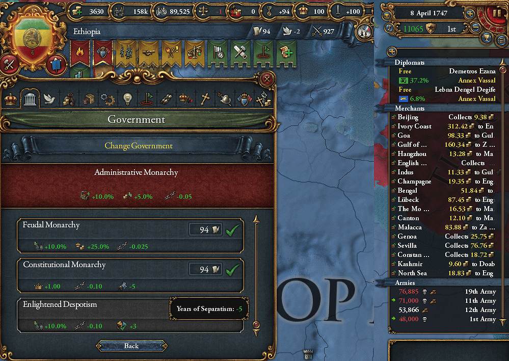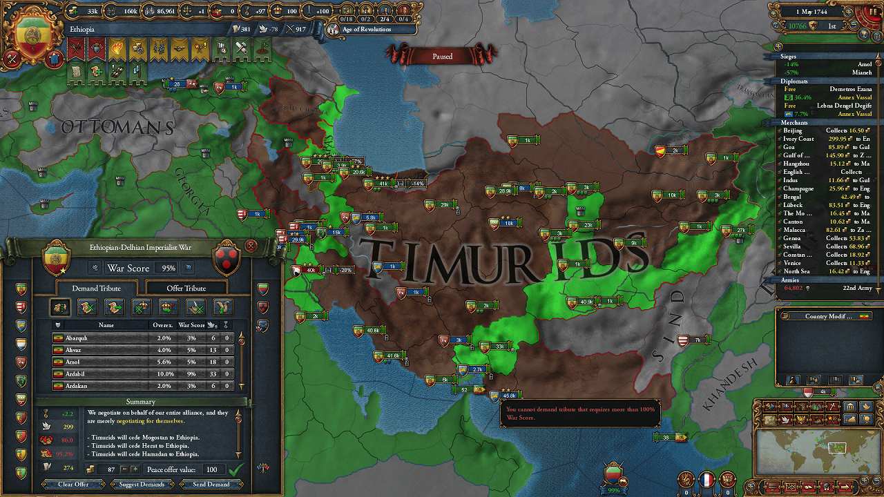 | Chagatai | 1779/05-1780/03 | Timurids | Chagatai | 1 | 啓蒙君主制に変更→Venice・蜀併合完了 |