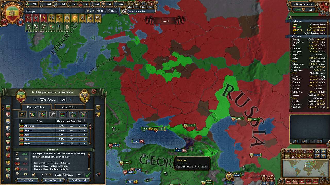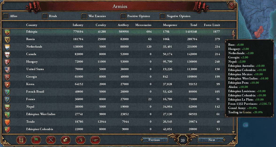 | Spain | 1782/09-1784/02 | Austria Spain | Tuscany Brandenburg | 2 | 新大陸に植民地国家追加、5.3.0の新帝 |