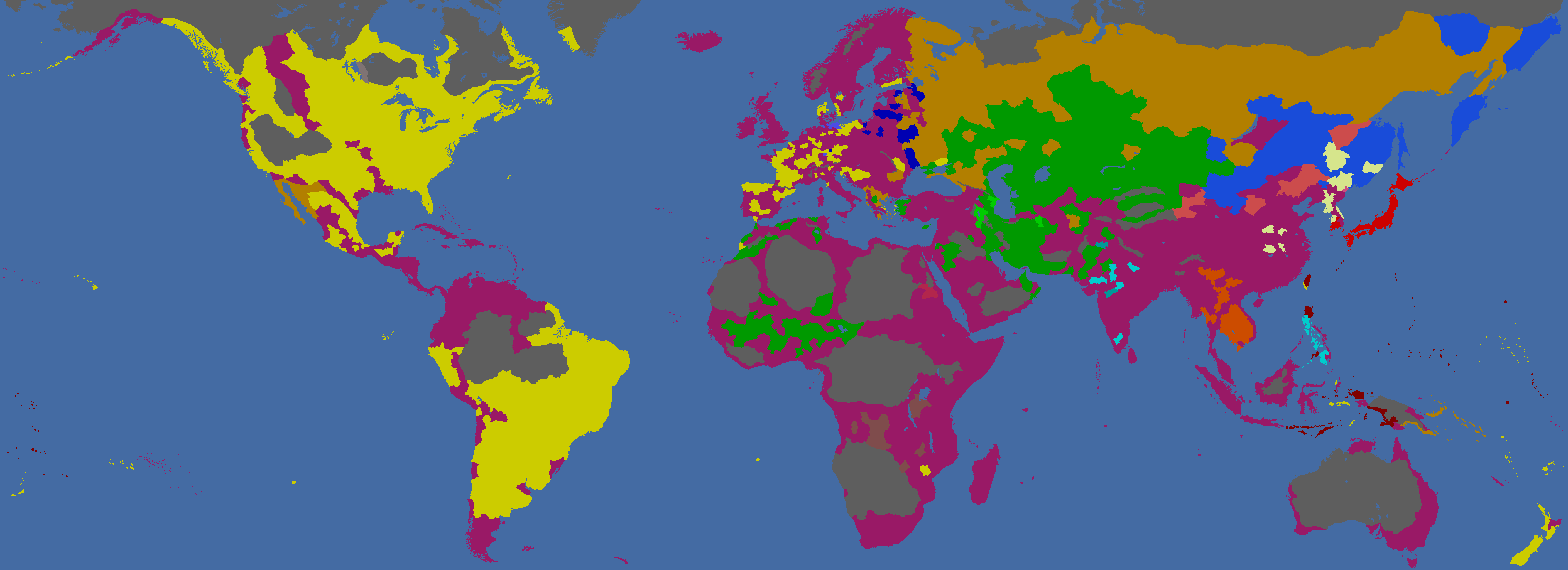 北米の東の明るい水色はUSA、その上の深緑はCanada(独立国家であり、Russiaの植民地ではない)