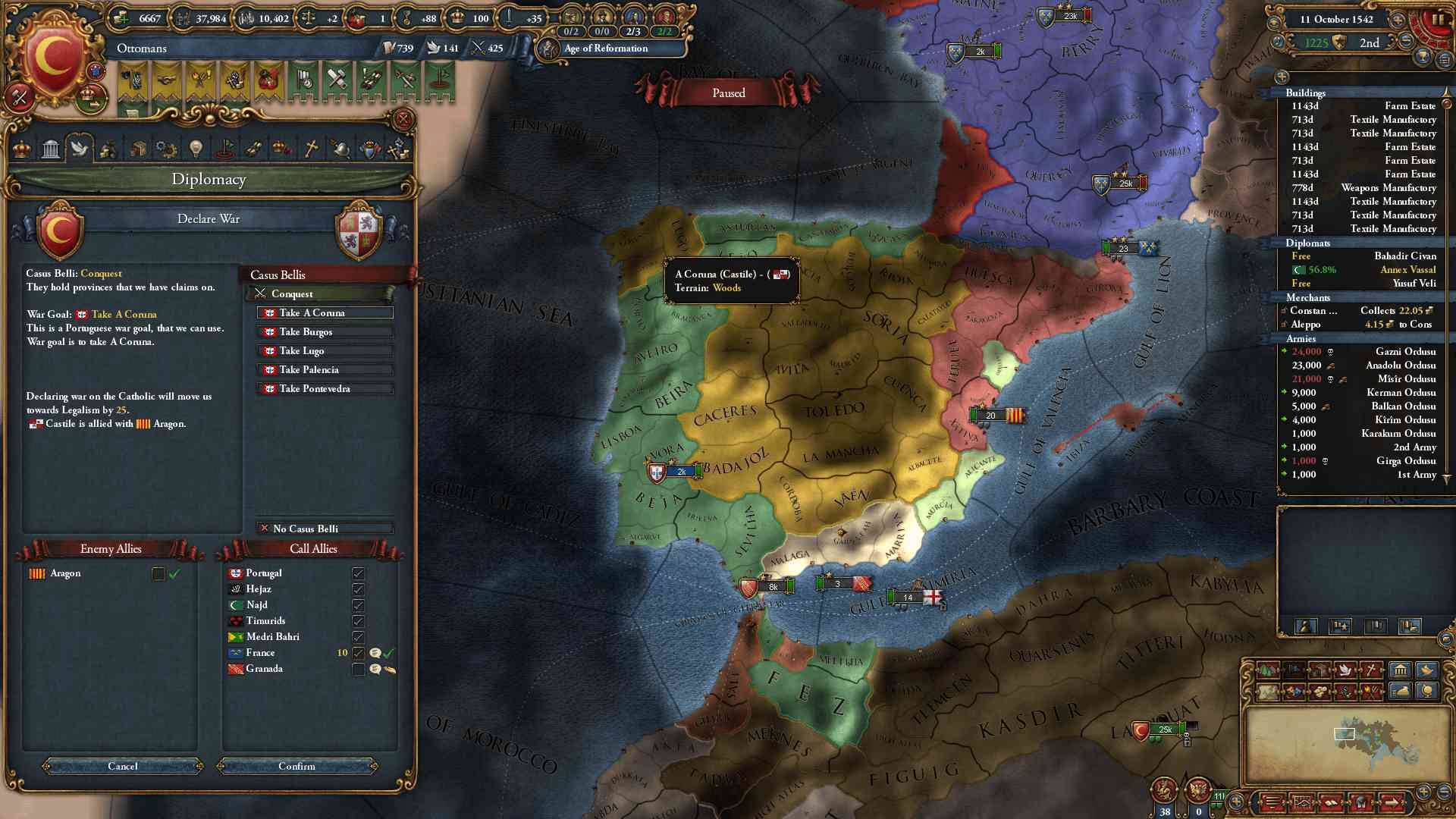 邪魔が入らないうちにOttomansに宣戦布告(Ottomansがユニットを作成する前に占領するため、隣接州で傭兵を生産中)