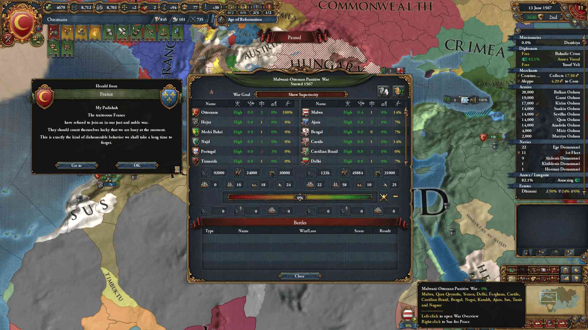 後から思えばどこでも良いので独立支援を頼んでおけば良かった。Ottomansの間にヘイトを貯めておいたので、候補は多かったと思う Ottomans戦はNajdのみで問題ないが、同盟が居ればその後の(宗主国Najdに対する)独立戦争を遅らせることができたかもしれない