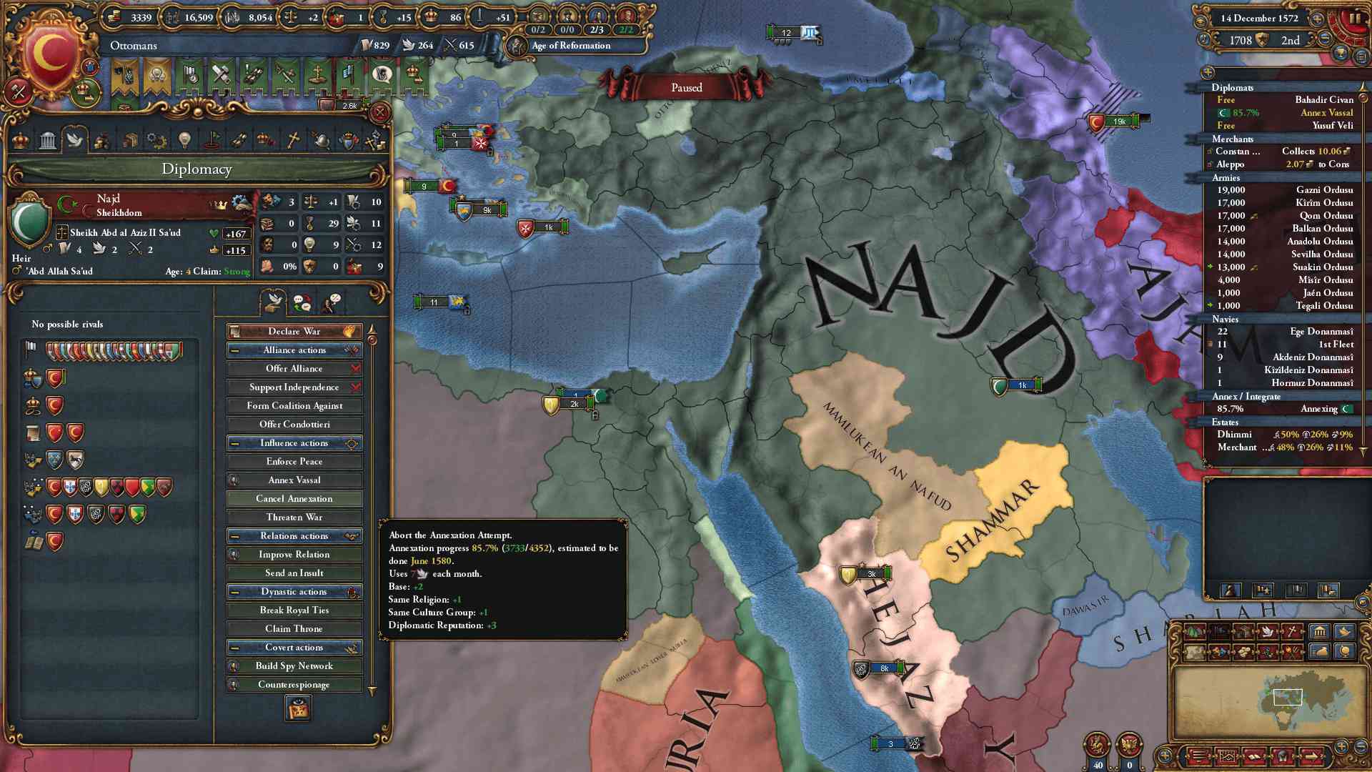 現在のNajdのDev合計が1058で必要な外交点が4352点。首都(Dev16)を除いたOttomansのDev合計は257-16=241