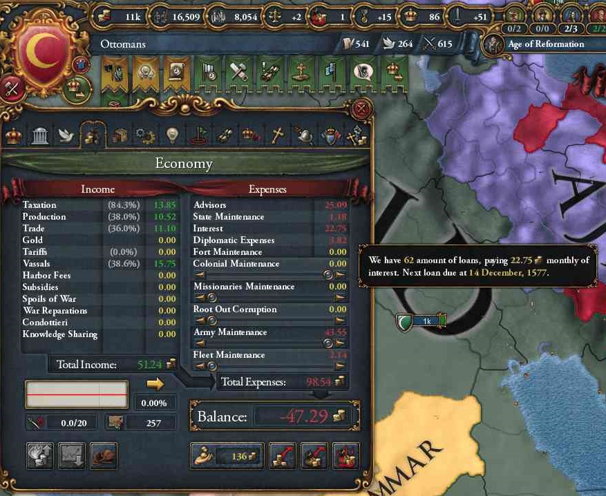首都移転後しばらくしてから収支が赤字になり始めた。直轄領の減少にも拘らず陸軍部隊を解雇しなかった(独立欲求対策)ので仕方ないと思っていたが、 首都を移転した際に交易首都(SELANIKはRagusaノード)も移ってしまったため、コンスタンティノープルでの徴収が減少して交易収入が低下していた 投了後にSSを確認している時に気付いた。相変わらずのドジっぷりである