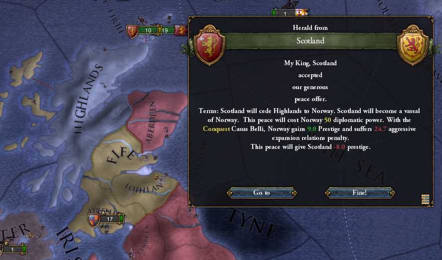 ハイランドの割譲とスコットランドの属国化で講和成立。 イングランドの電撃侵攻によってアバディーンを奪われる羽目となる。
