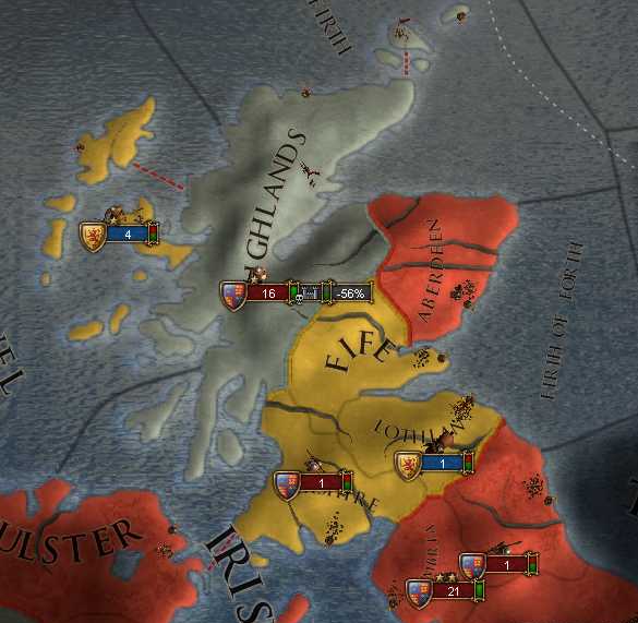 アイルランド島内に閉じ込められ無力化された5万の兵士。 この後、調子こいて見逃していたスコットランド守備隊に占領地を全て奪回される始末。驕りは身を滅ぼす。