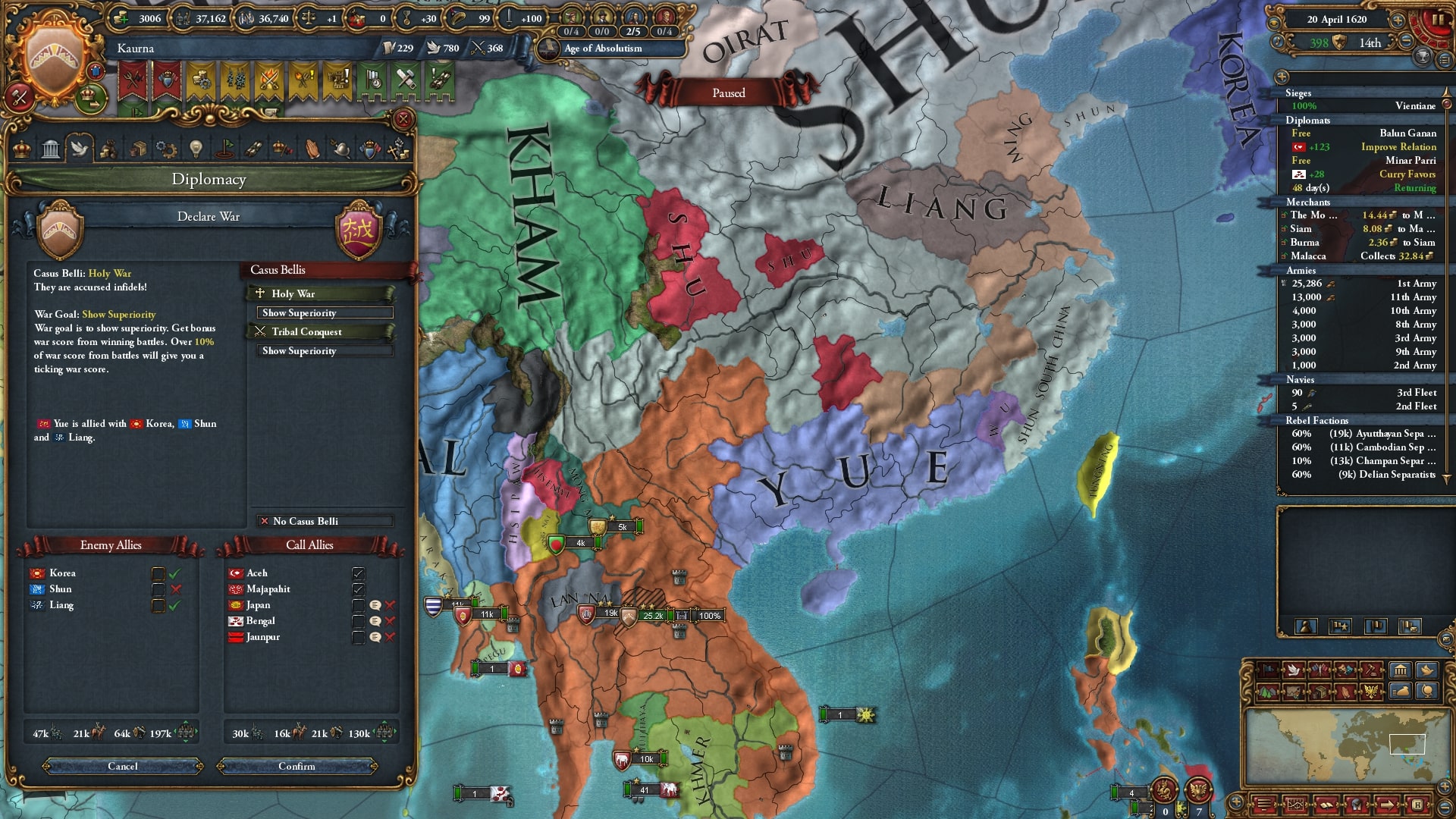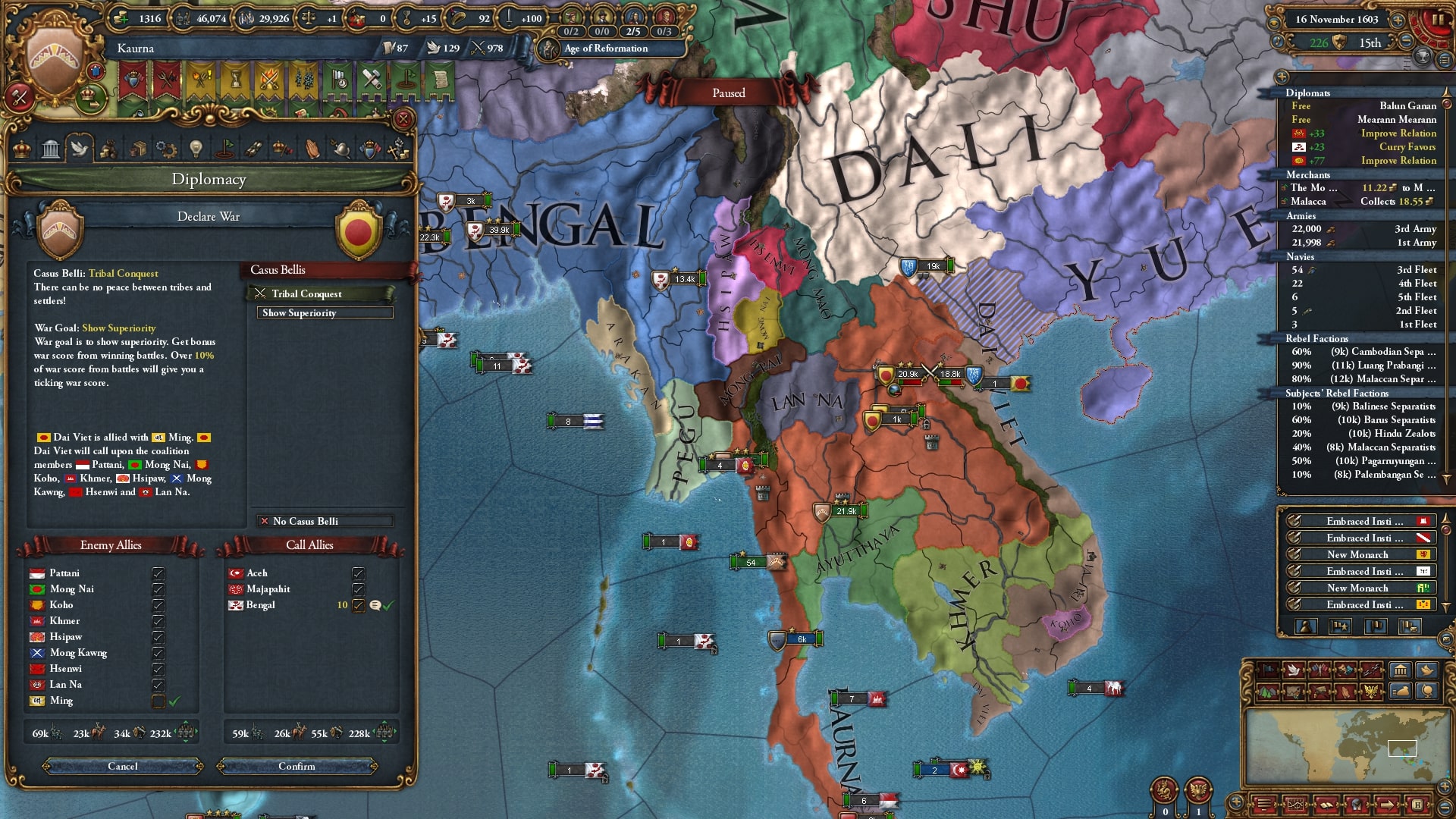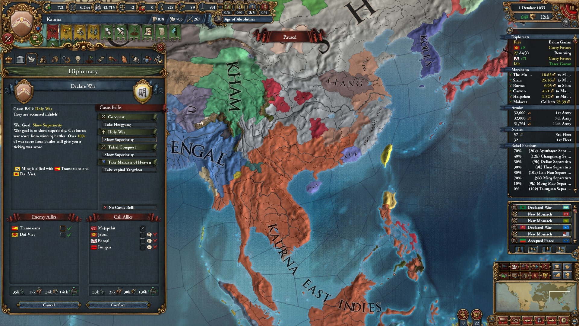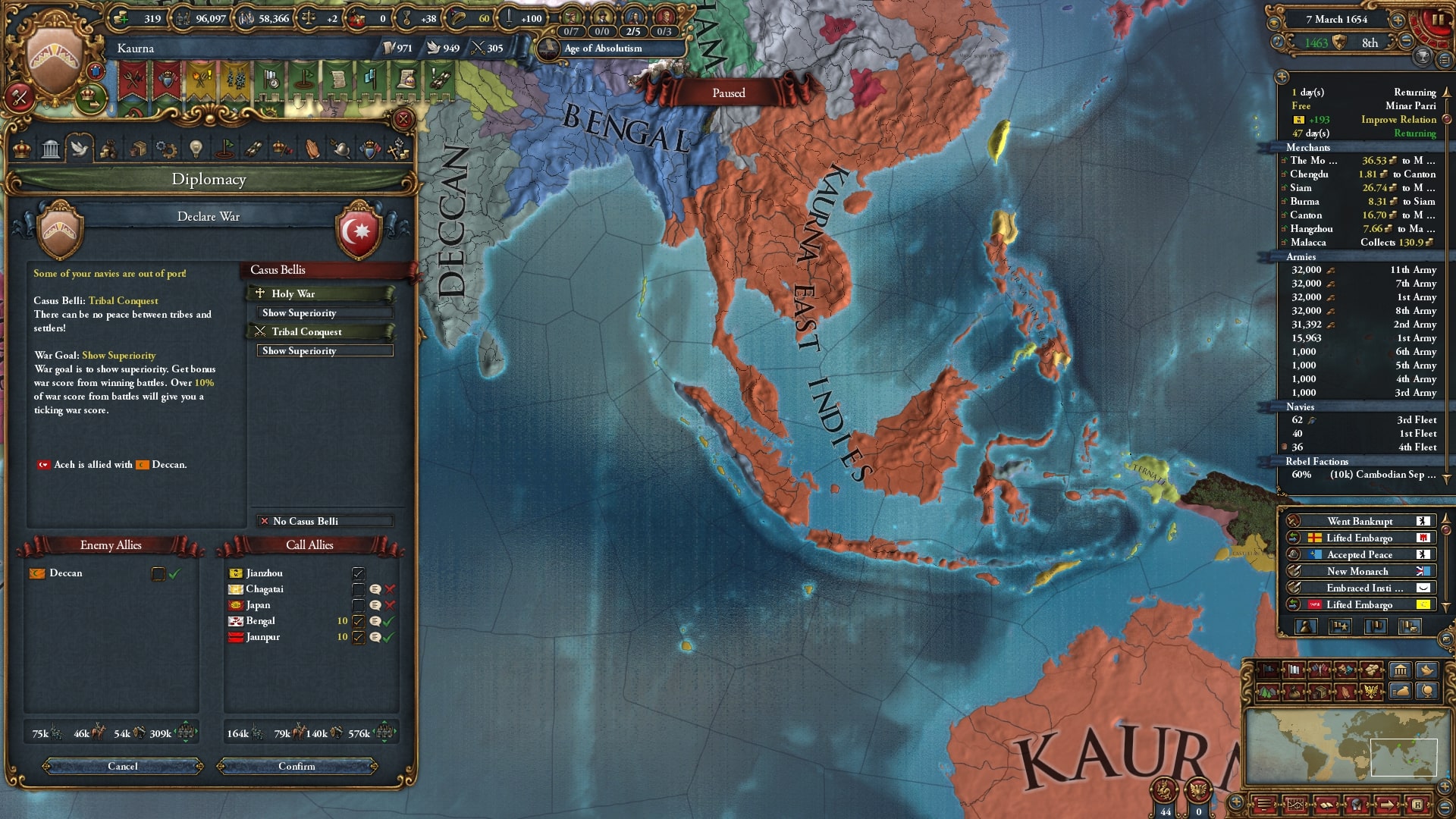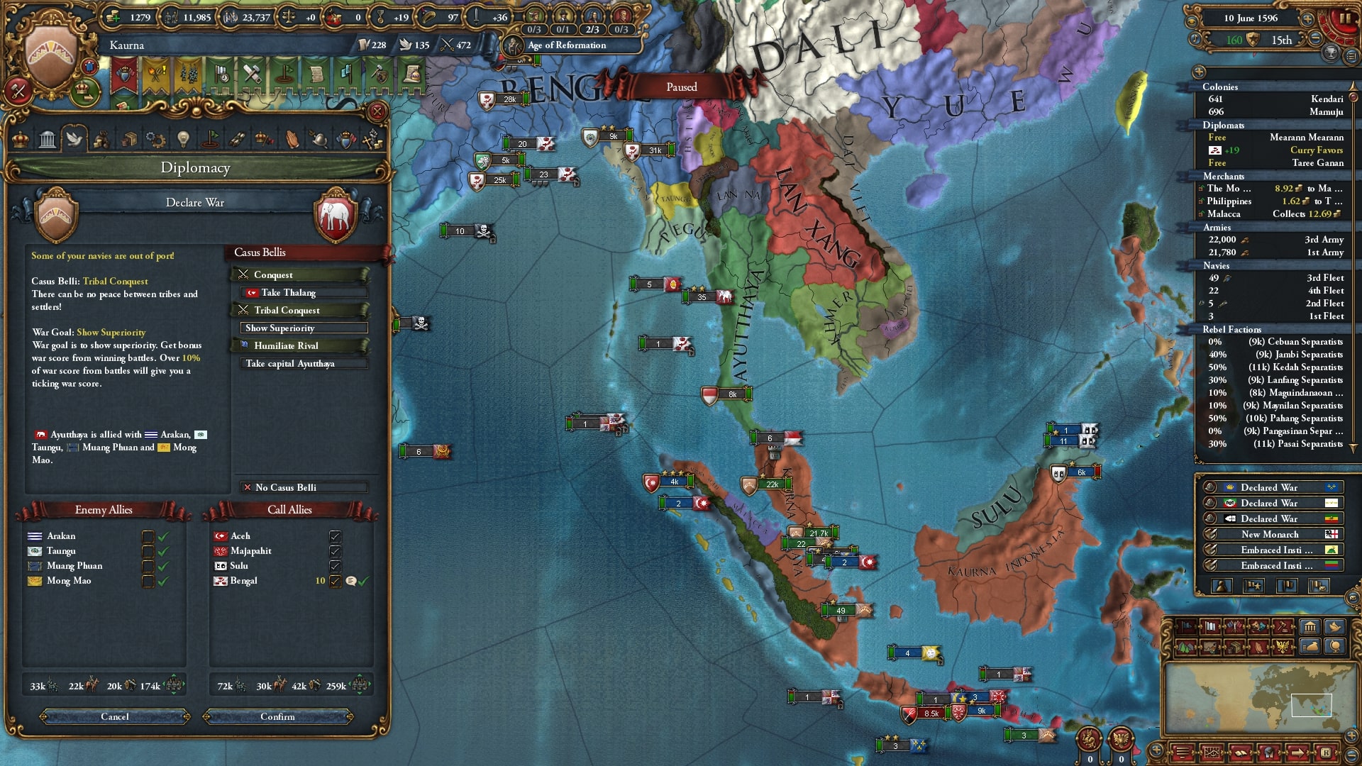 ついにユーラシア大陸側へと本格侵攻開始。まずはアユタヤ/Ayutthaya、同盟国ベンガルを呼び出して宣戦します。