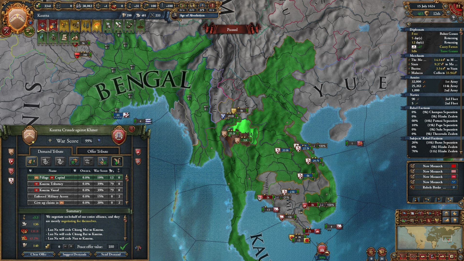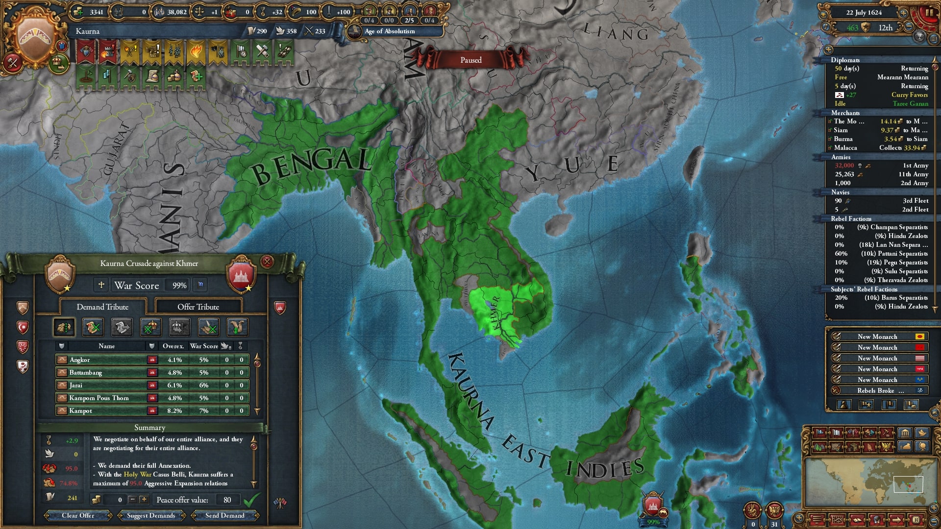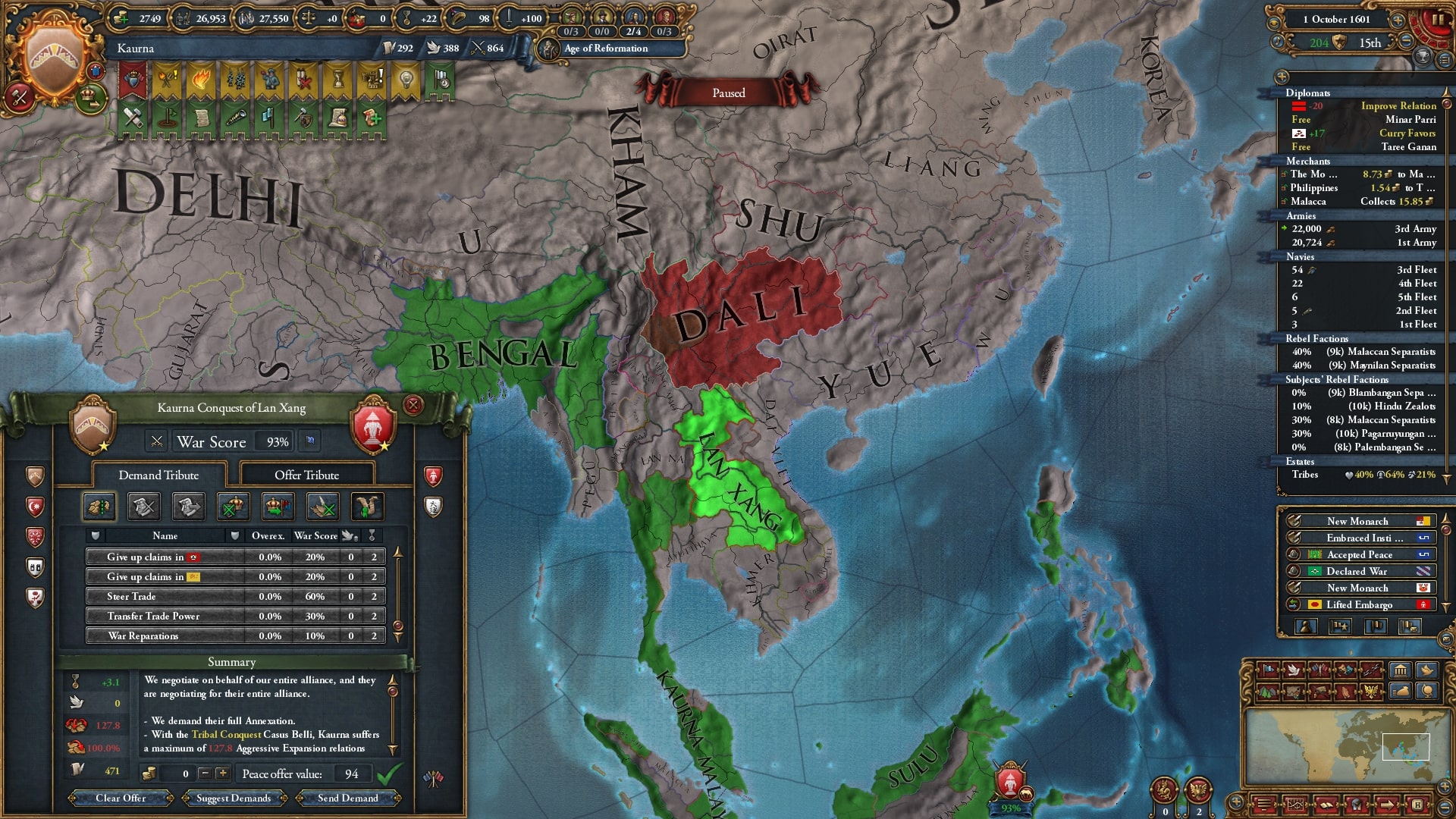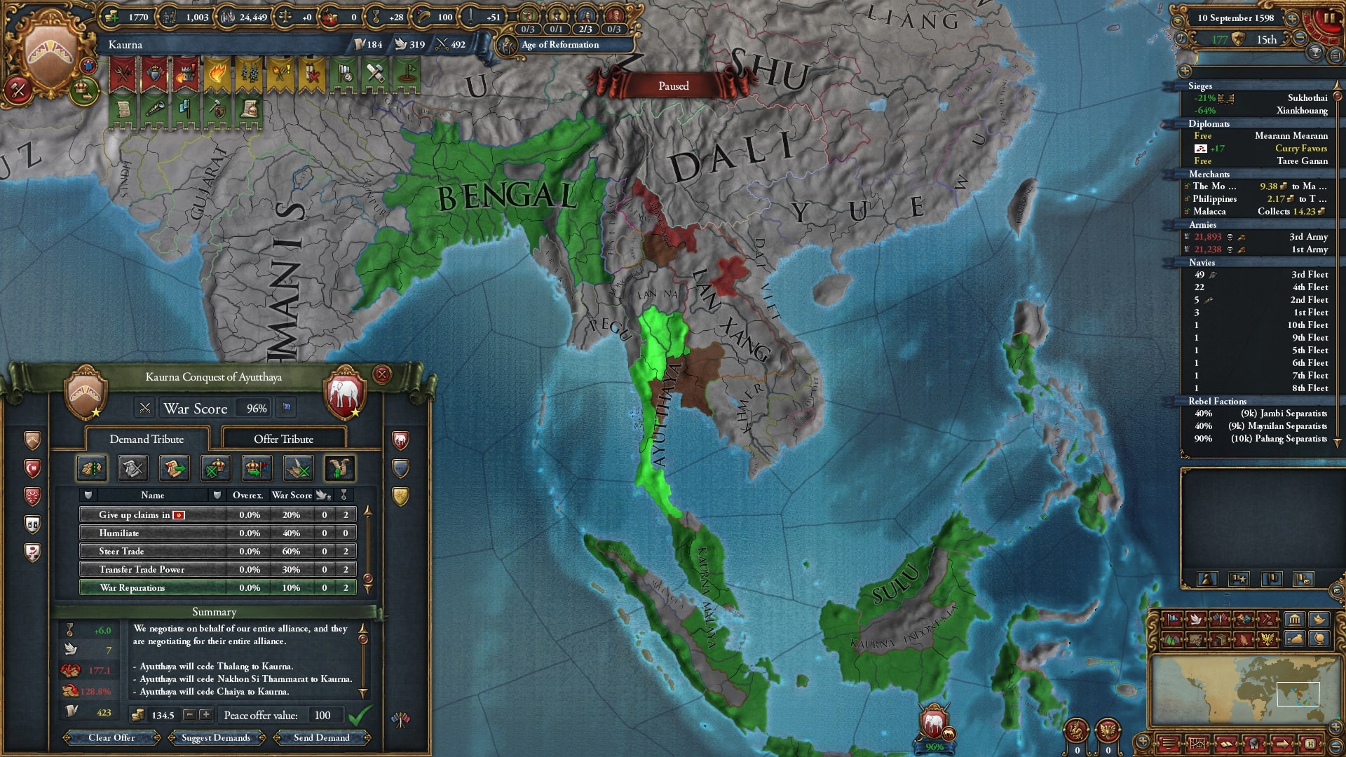 欠かさず小国を併合。モンナイ/Mong Nai相手に負け講和をしてスンニ派に再改宗した属国アチェを解放しています。