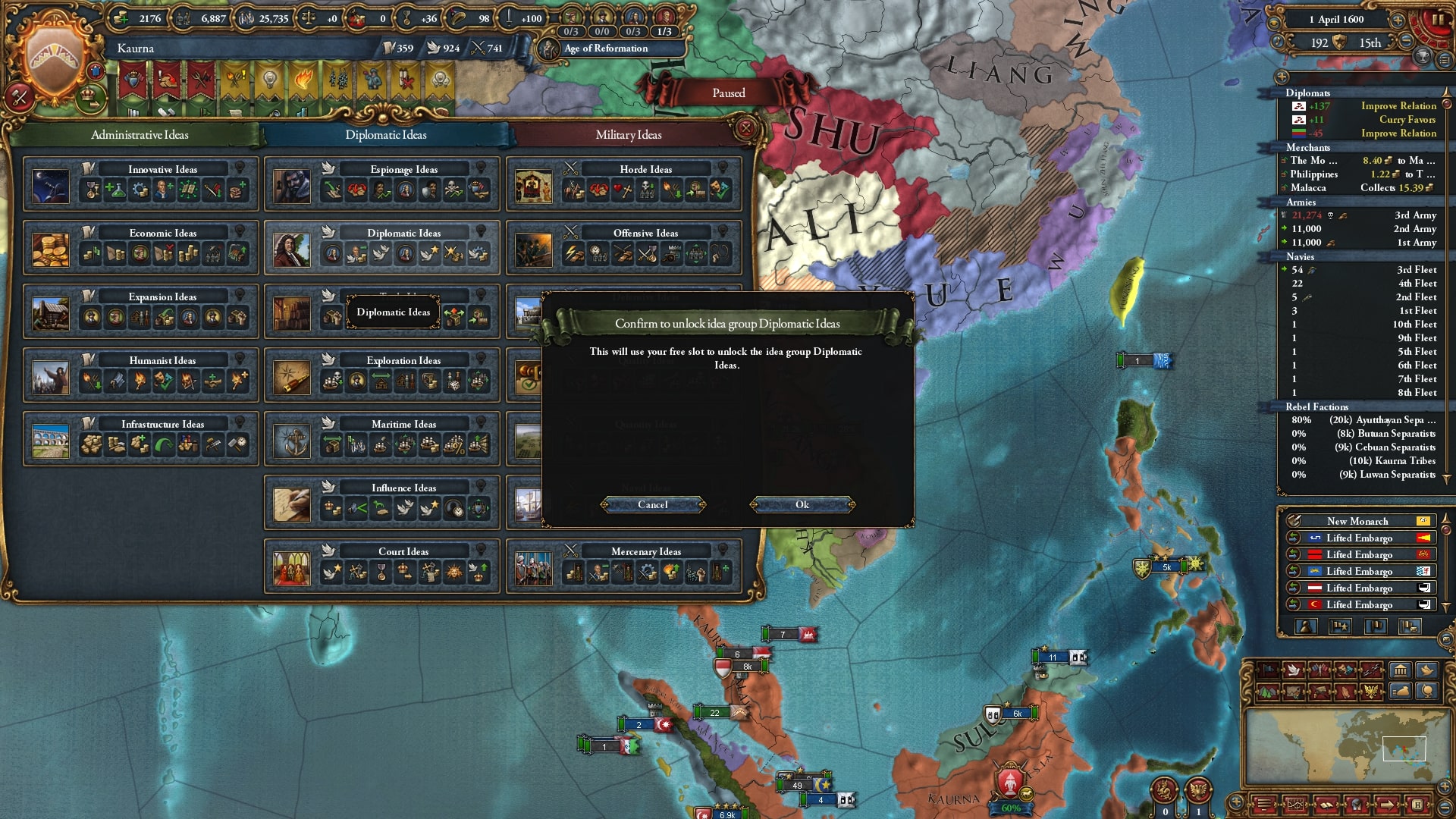 ラーンサーン戦中に探検アイデアを破棄し外交アイデアに変更。植民自体はマラッカノード/モルッカノードを中心にある程度は完了、残りは属国マジャパヒトと朝貢国テルナテにしてもらい、後から併合します。