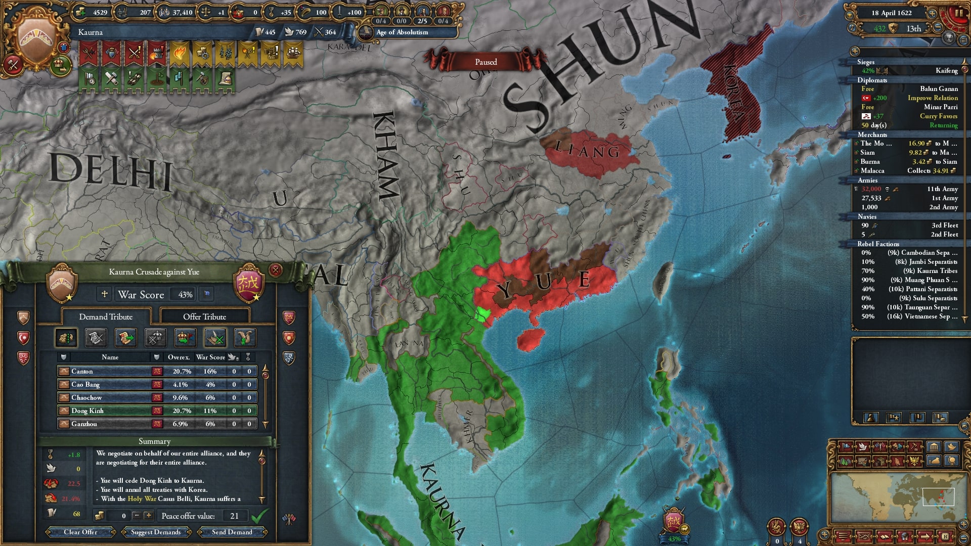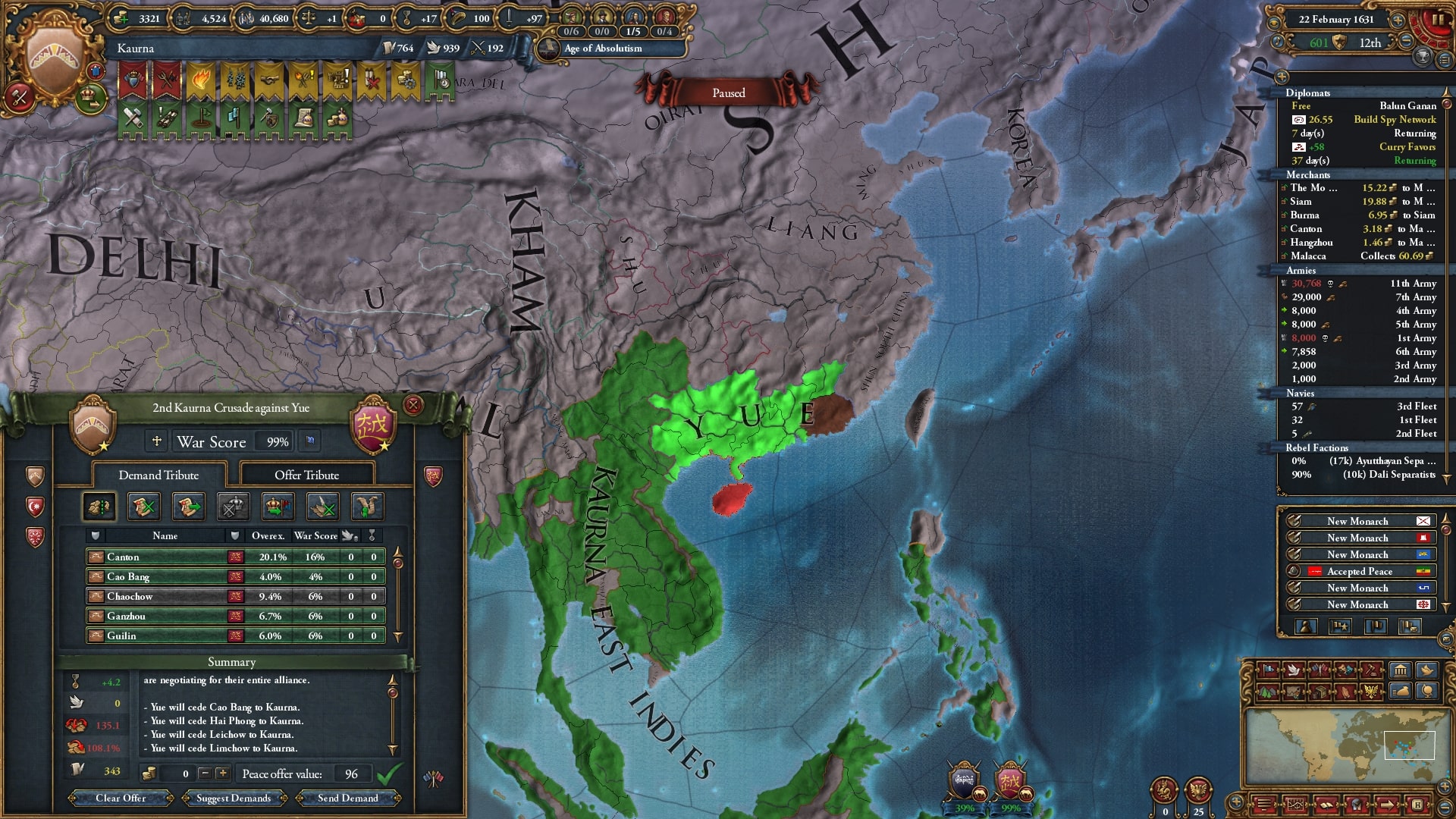 結局4年ほどはかかりましたが98点分の講和で大越/Dai Vietの領土をほとんど獲得しました。人的資源が枯れかけました。