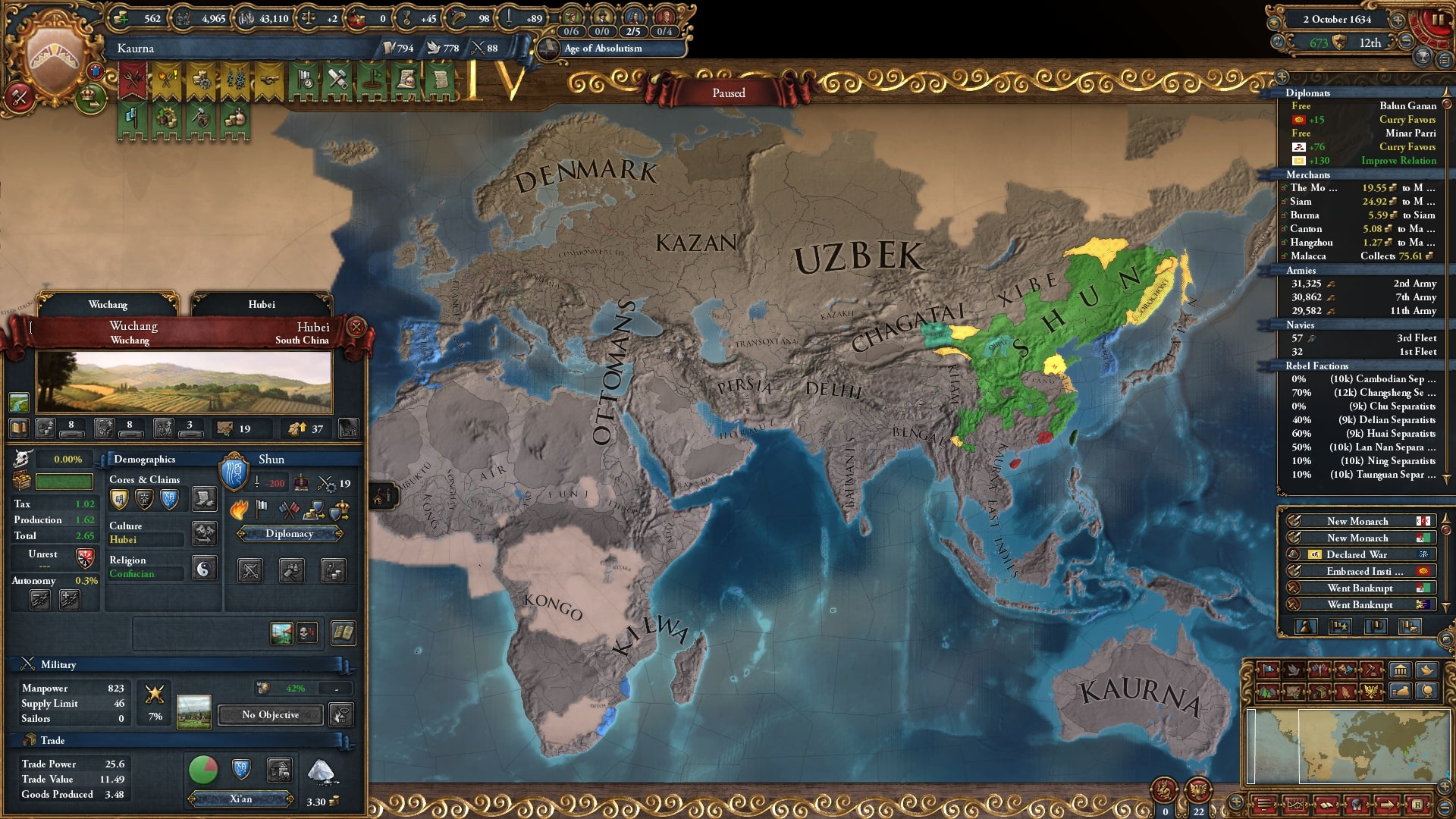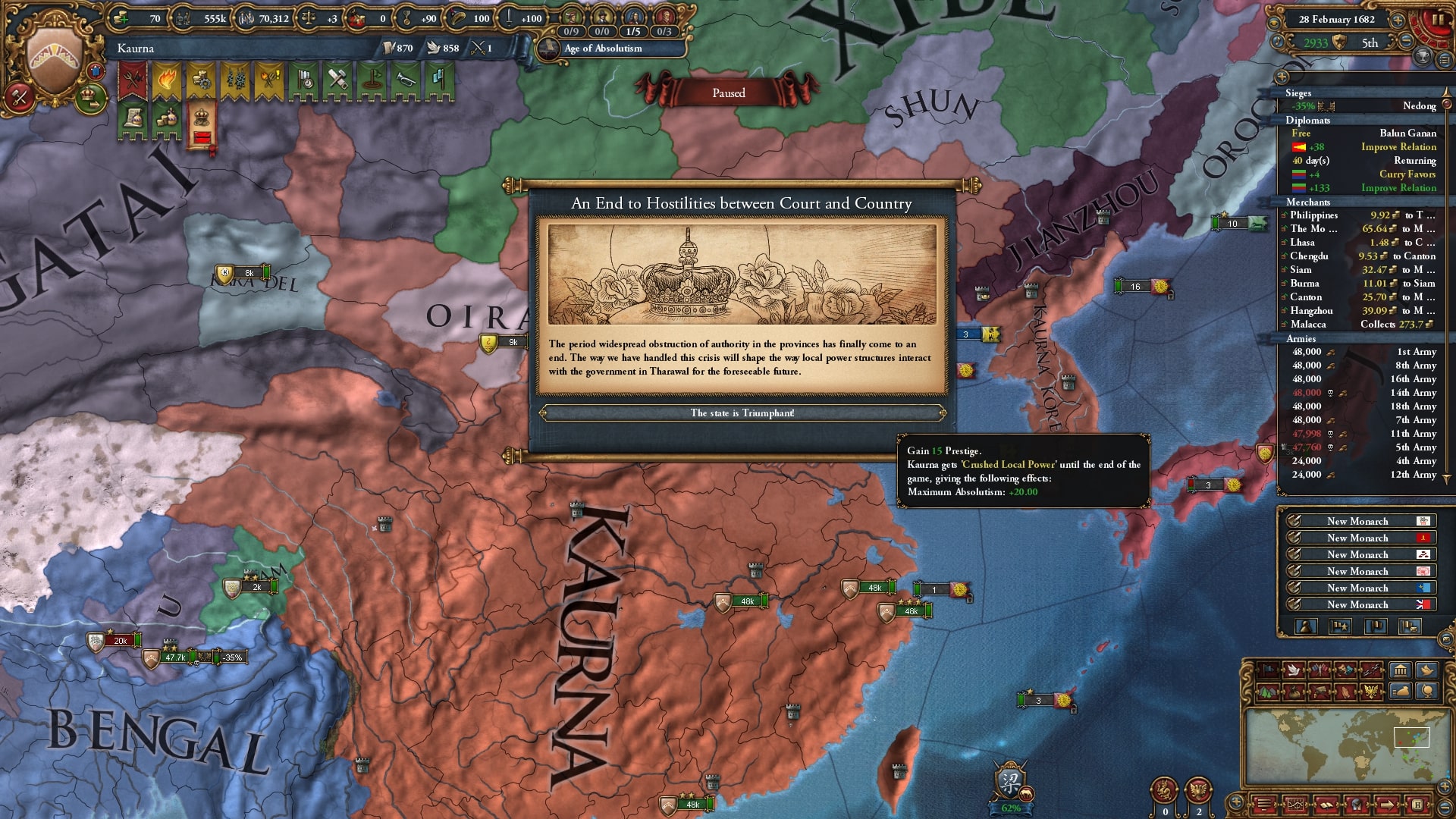 順戦後すぐに順に停戦破棄で攻め込み、国難の発生条件を満たしていました。本プレイではさすがに国難を利用しないと最大絶対主義の値が厳しめです。ラッシュに間に合うように1672年に国難開始。