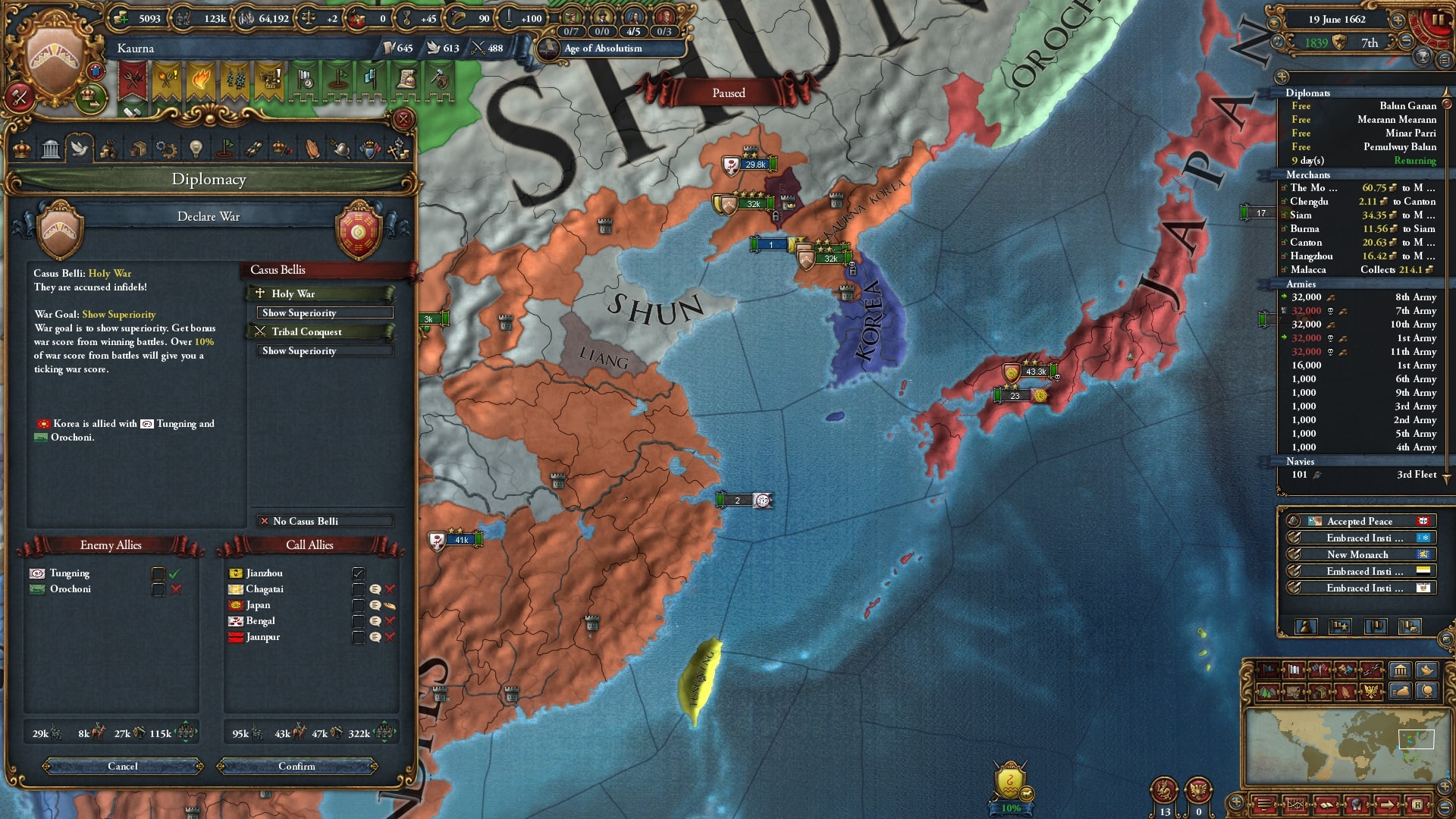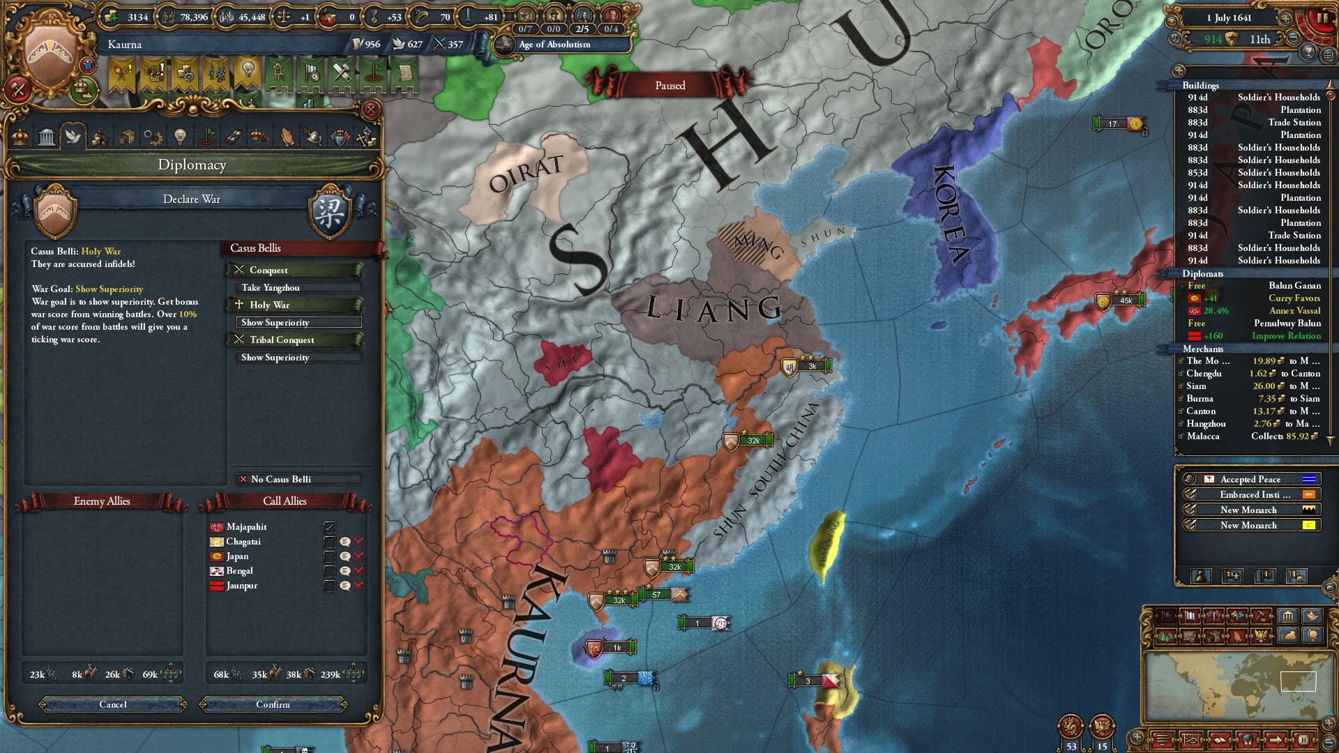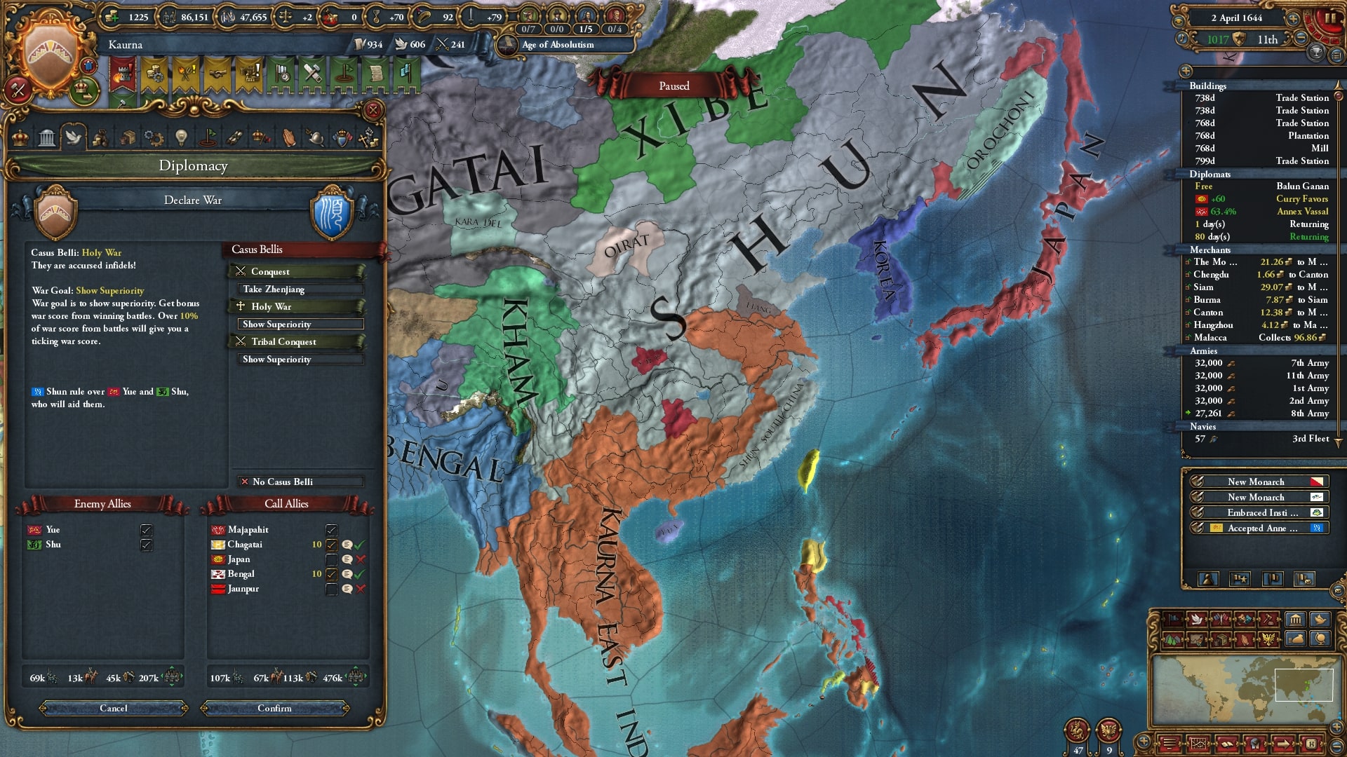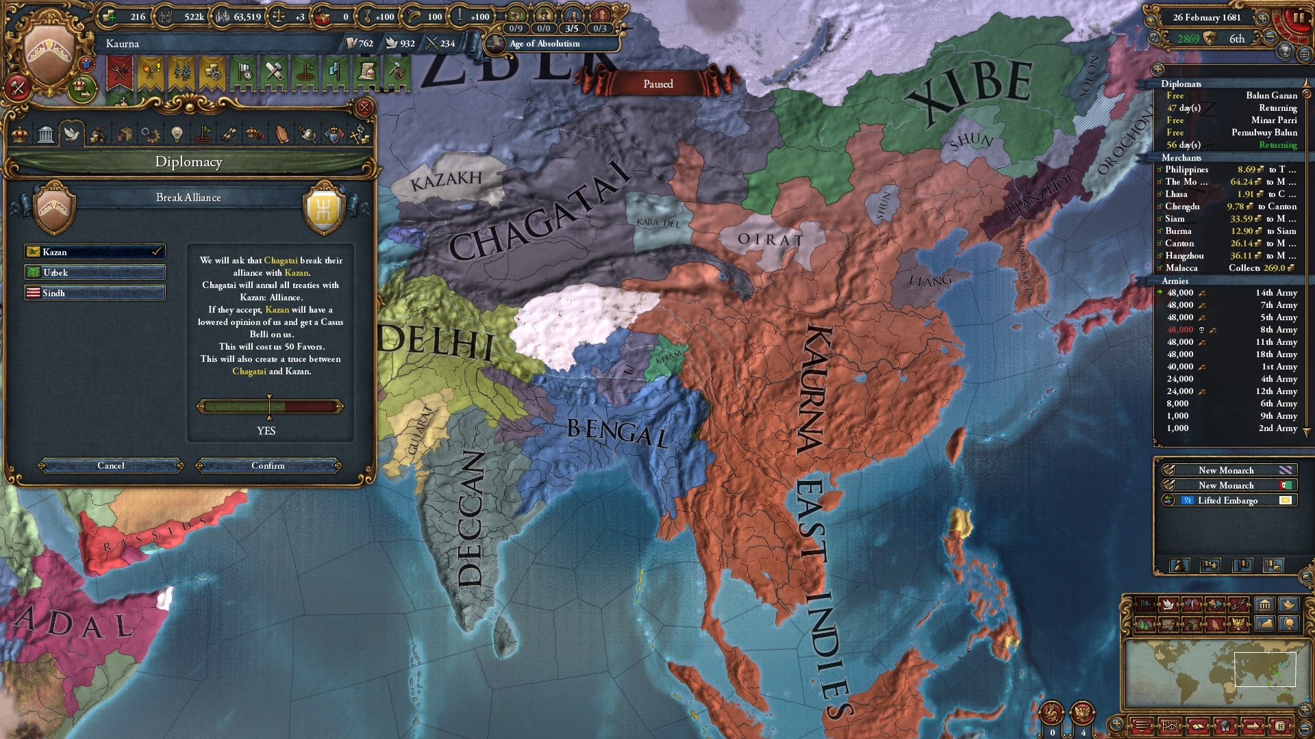 本格的な中華侵攻に入ります。停戦明けの順に宣戦、ベンガルと同盟済みのチャガタイ/Chagataiを呼びだしました。