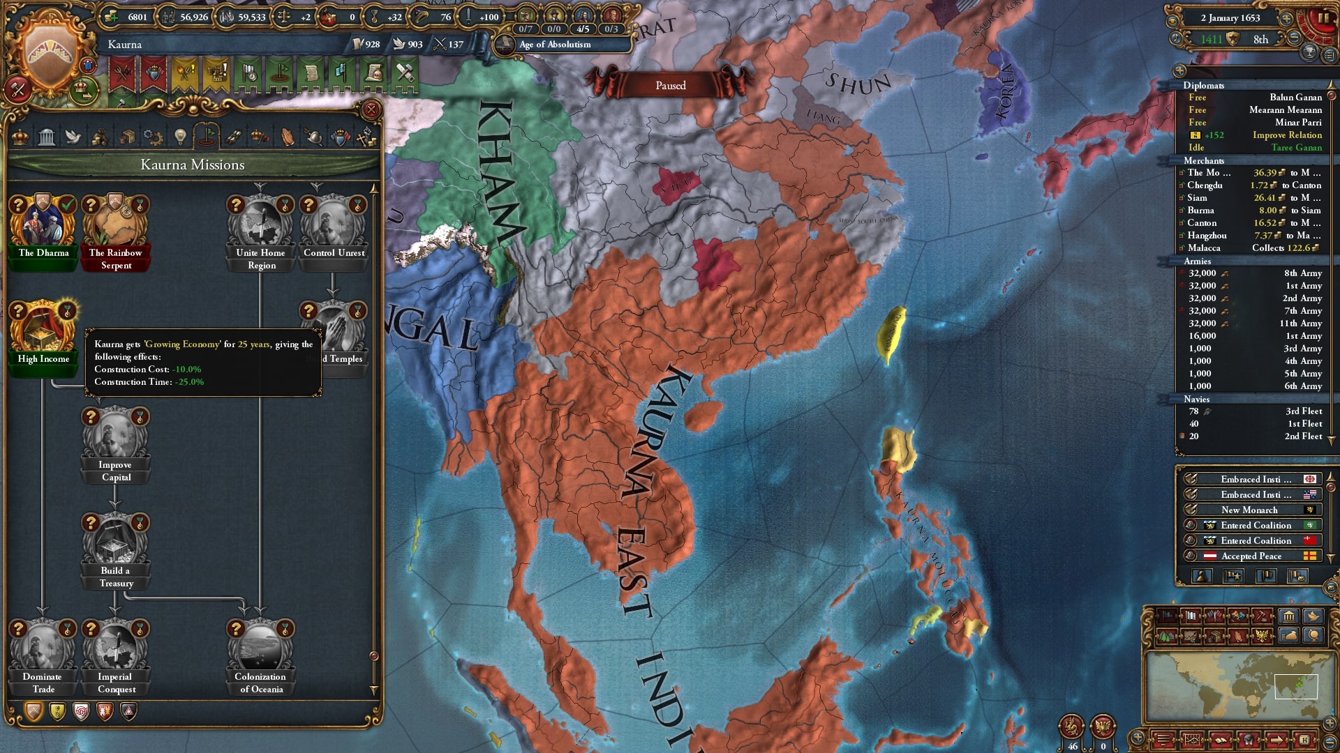 さて、中華支配は道半ばですし、新大陸には到底行けそうにありませんが、ラッシュを始める1687年は確実に近づいています。建造物は少しずつ建造していますが圧倒的に足りません。マラッカノードの上流側をある程度抑え、収入にある程度余裕も生まれたので1650年から猛スピードでの建造を始めることとします。