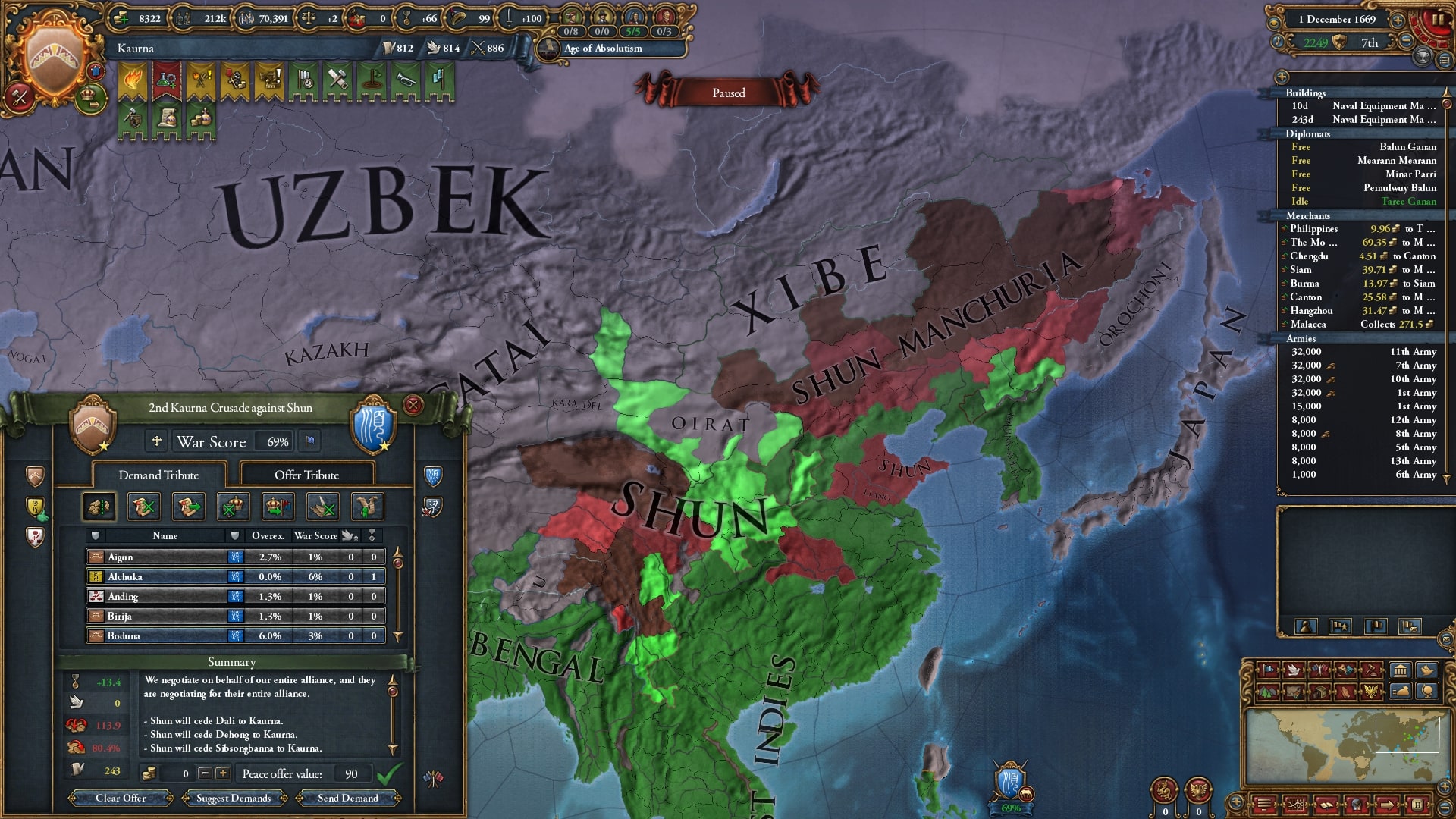 オイラトを使って停戦短縮していました。再びベンガルを連れて順に宣戦、中華皇帝位にようやく就いていたのもありさすがに余裕でした。なかなか領土が獲れないです。