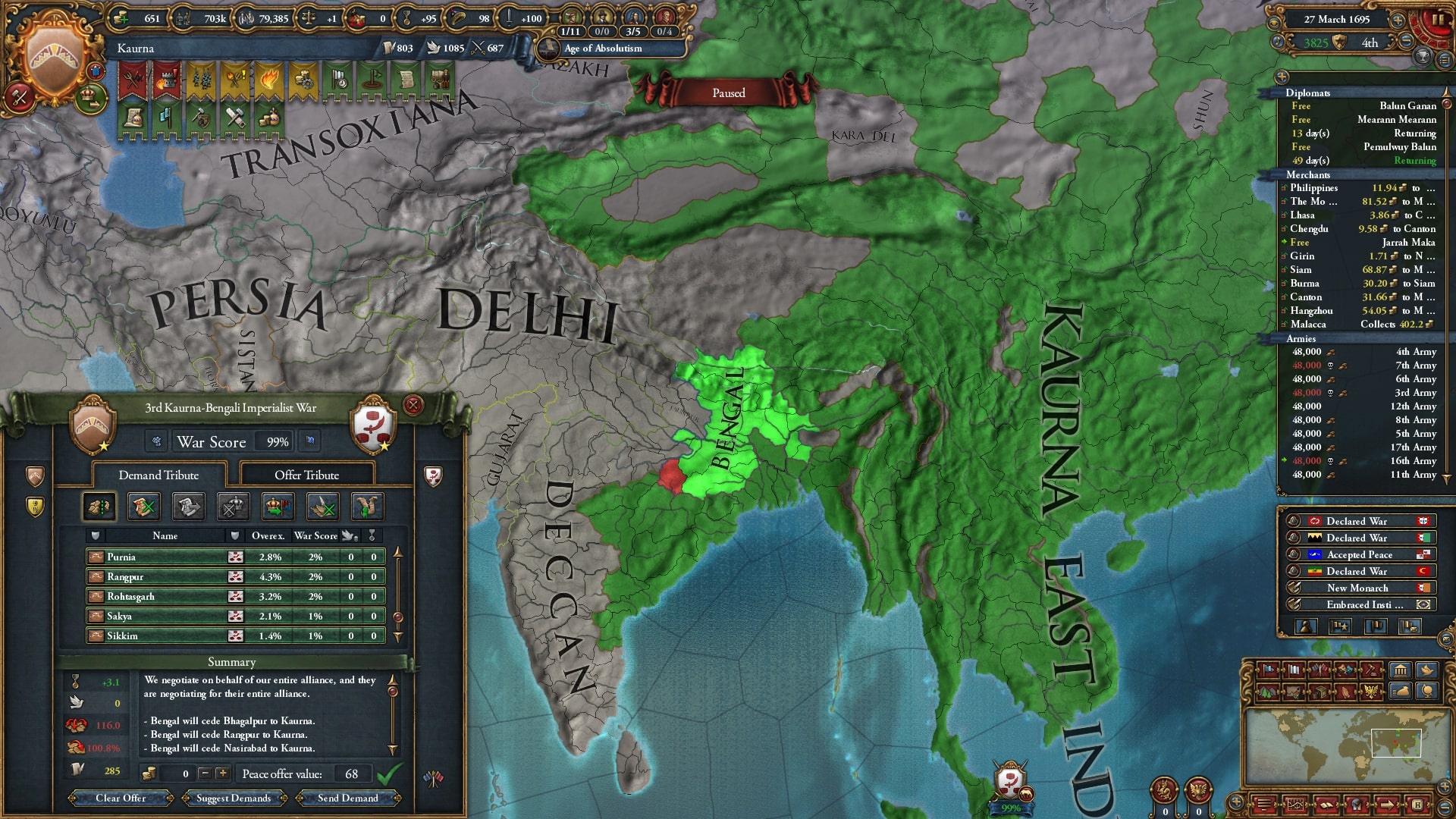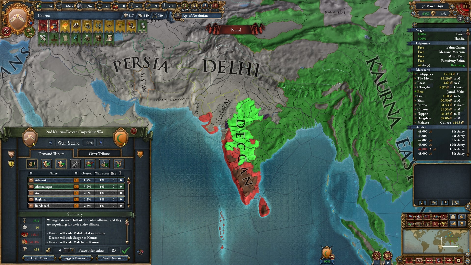 とりあえずペルシアとの同盟を切らせることには成功、後は停戦破棄でデカンをゴリゴリ削るだけ。