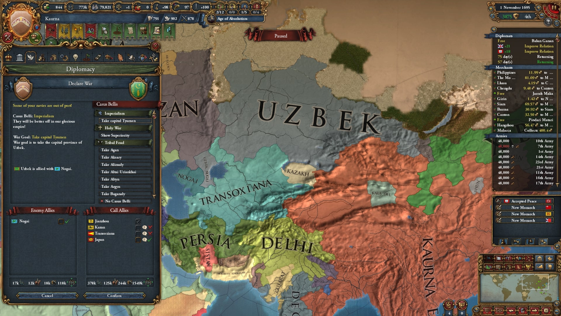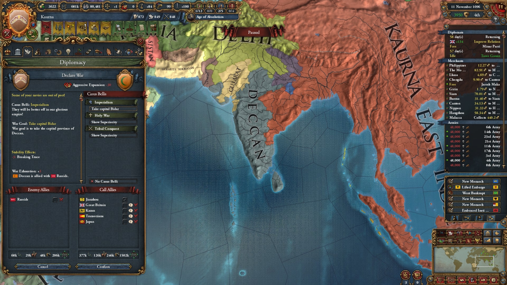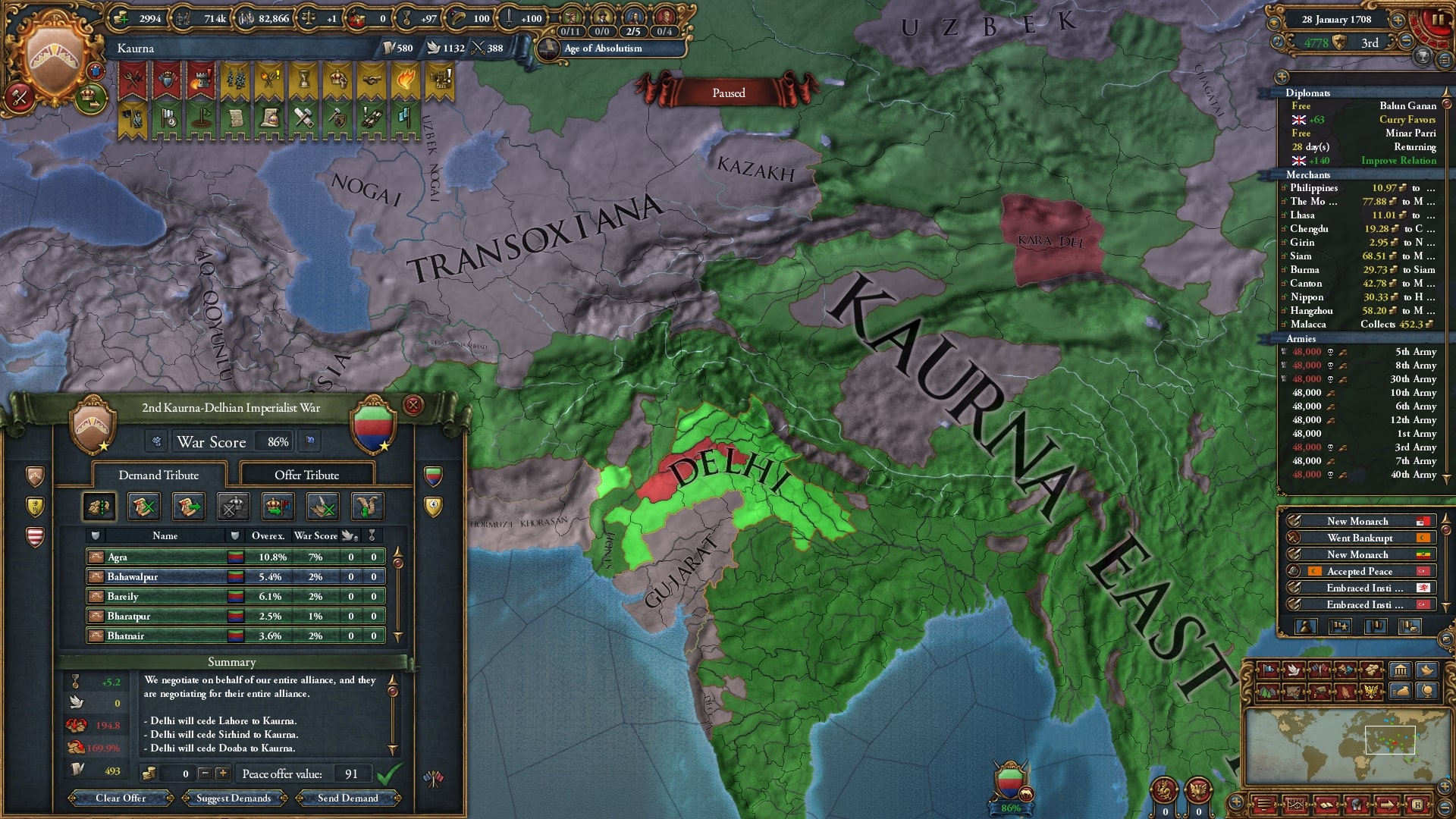 今の同盟のうち、日本を除くジャウンプル・デリー・トランスオクシアナは攻撃用の同盟という目的以上に、AE圧縮・同盟破棄後の5年間の停戦期間目的の方が強かったりします。外交点は大量に余っているので、これ以降も様々な国家と同盟しつつAE/停戦の管理を行っています。