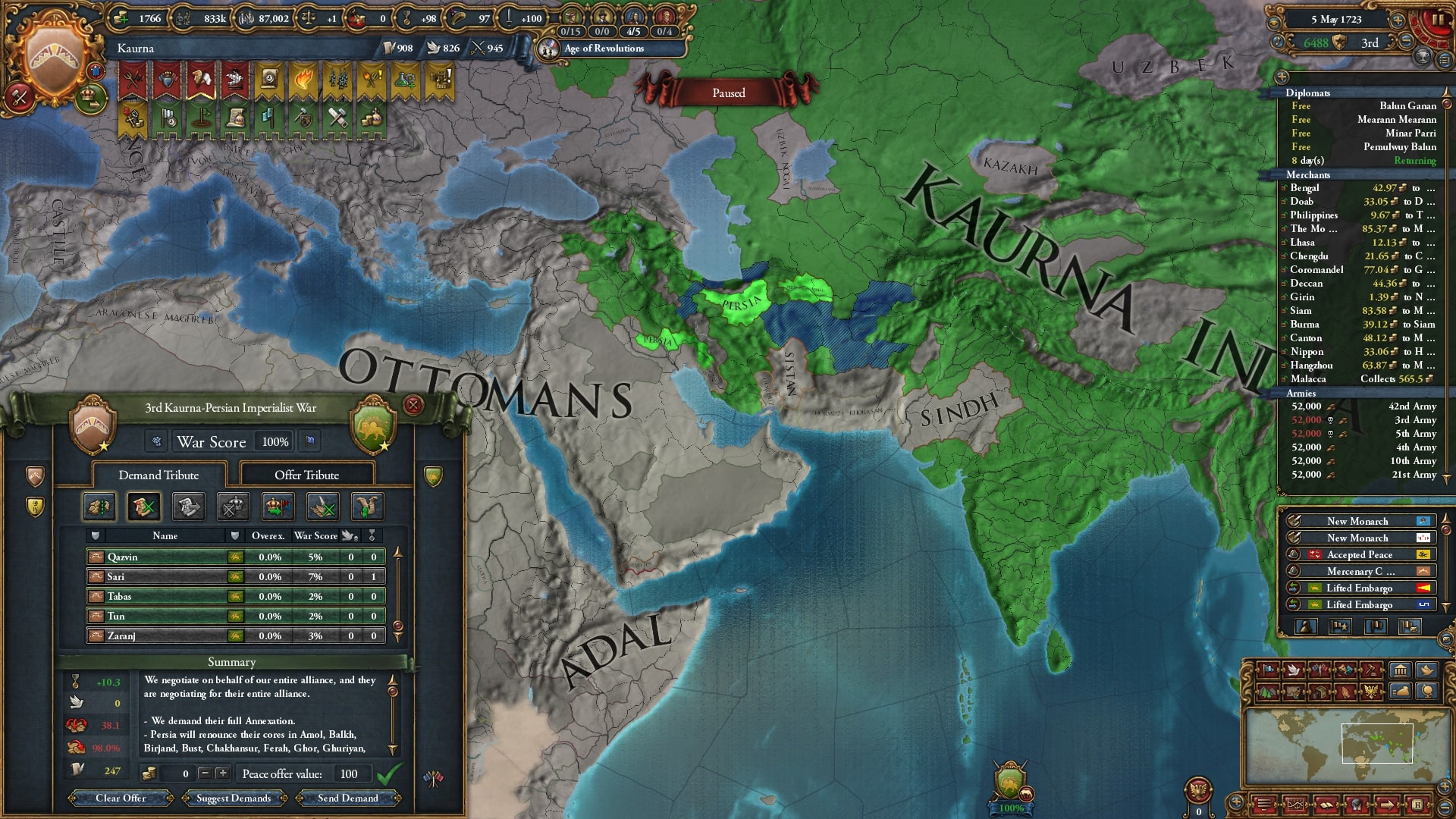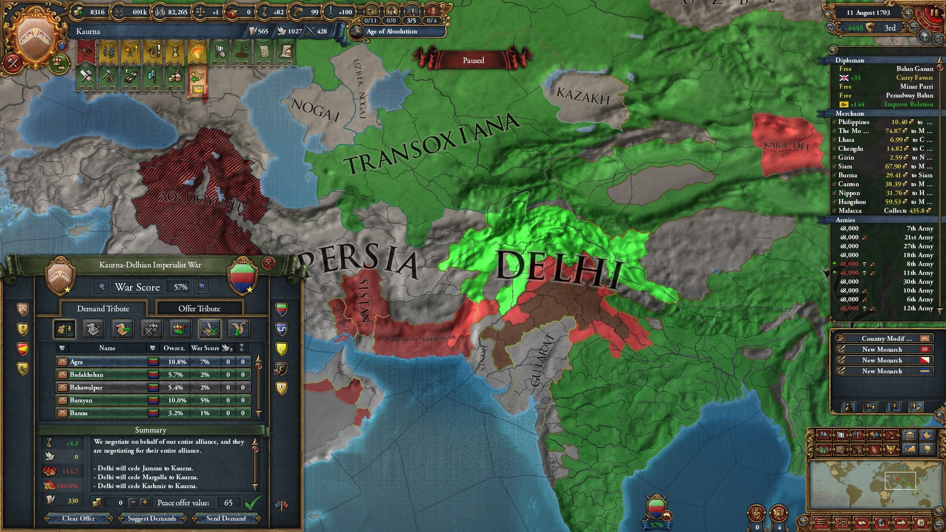 面倒なシーア組、デカン&ペルシアを同盟国連れて崩す目的でした。たださすが1.36ペルシアと言ったところでしょうか、トランスオクシアナ&デリーが押し返され、戦勝点がたまらないので最低限で早々に講和することに。