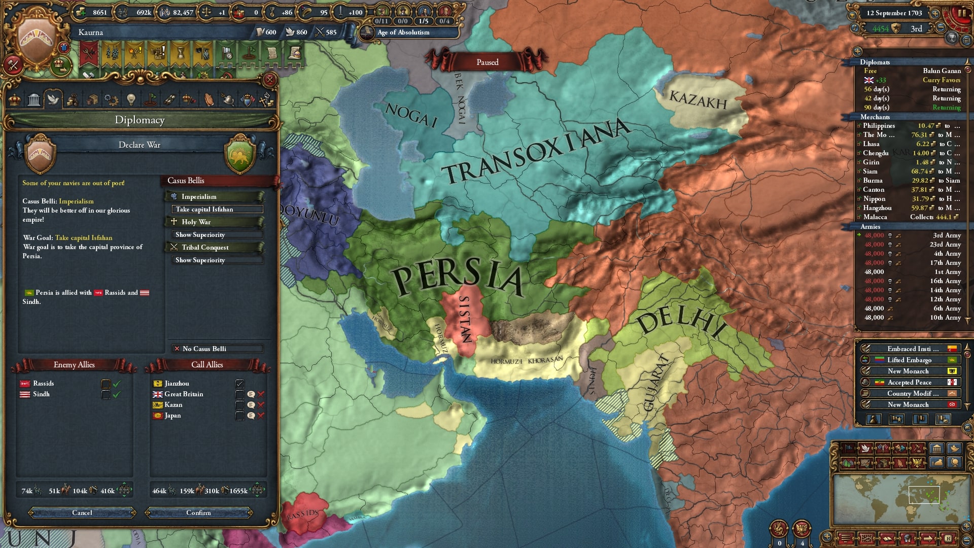 オスマンと白羊朝の同盟は1702年頃にオスマンが白羊朝の同盟国に攻めたことで外れていました。停戦期間が切れる前に白羊朝の併合までもっていきたいところ。