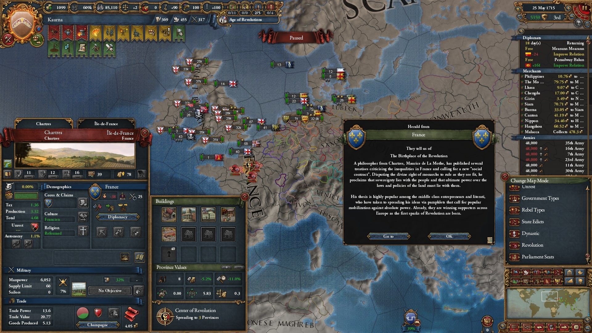 1715/3、フランスにて革命の中心地が発生。結論から言うと革命の標的は未発生で終わりました。