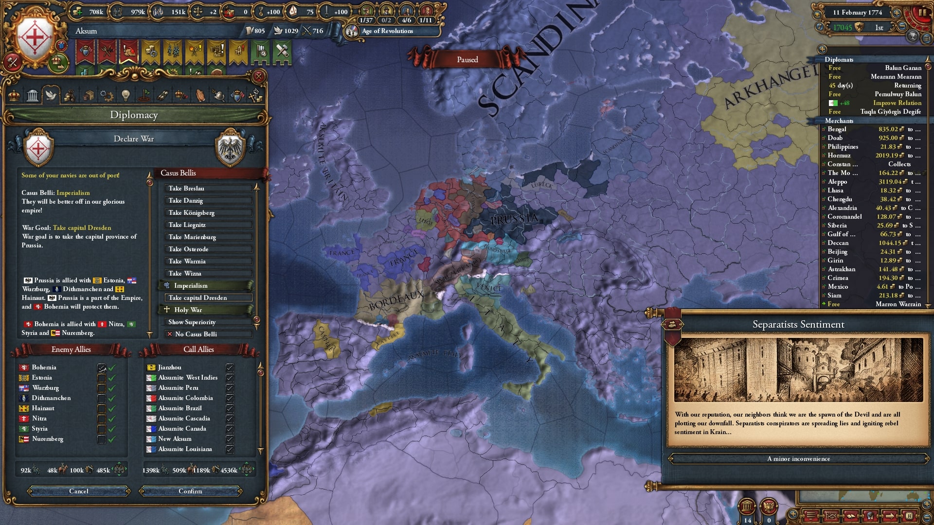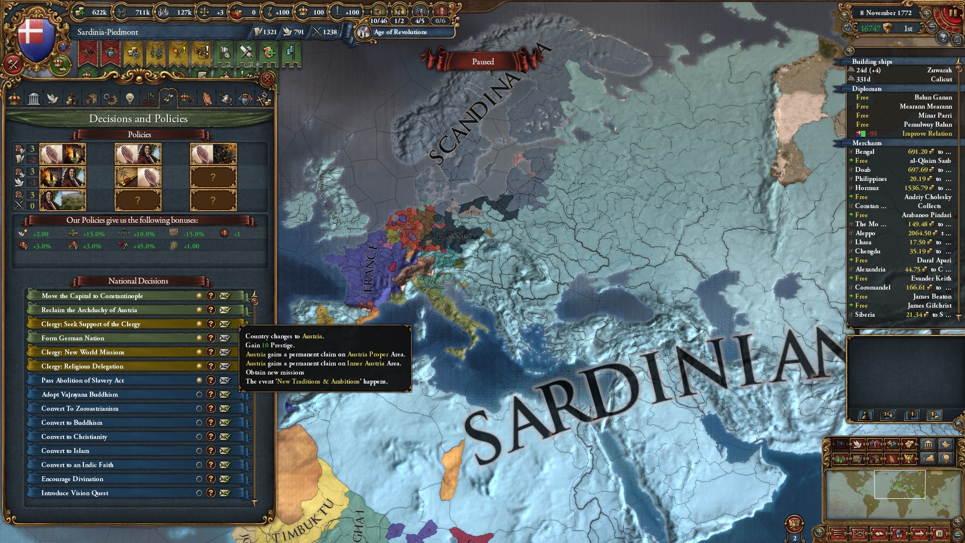 開発度も収入も陸軍も植民地国家も十分にそろっています、まあ1772年ですから当然なのですが。
