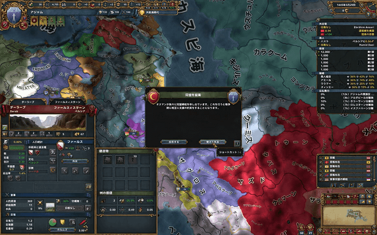 理由としてはこの国が領土欲強いと警告出さない限りギーラーン(アジャムの北にある黄色い一プロビ国家)を先に征服されて面倒なことになるからですなw
