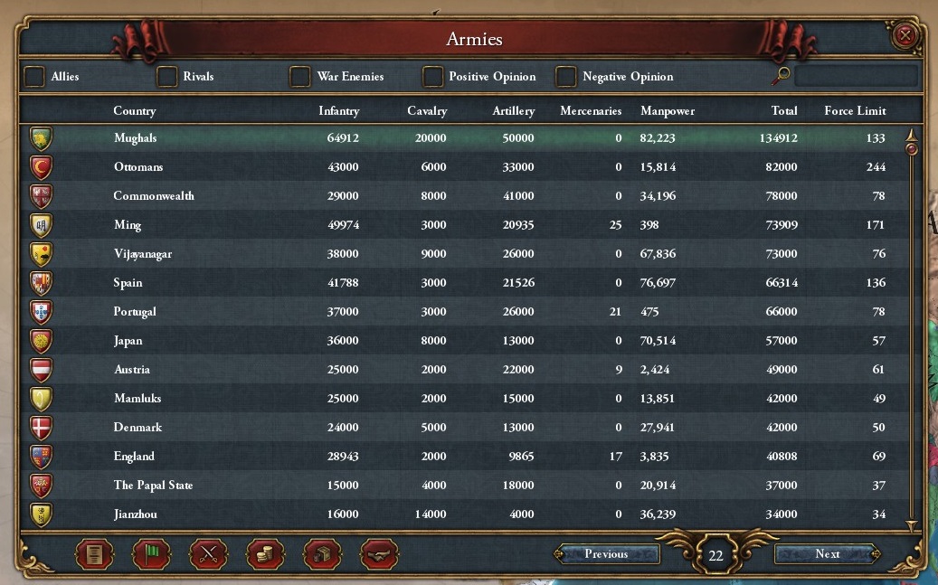 1557年の各国兵力数比較。オスマンは軍量アイデアを取っているので最大保有兵力が232Kです。