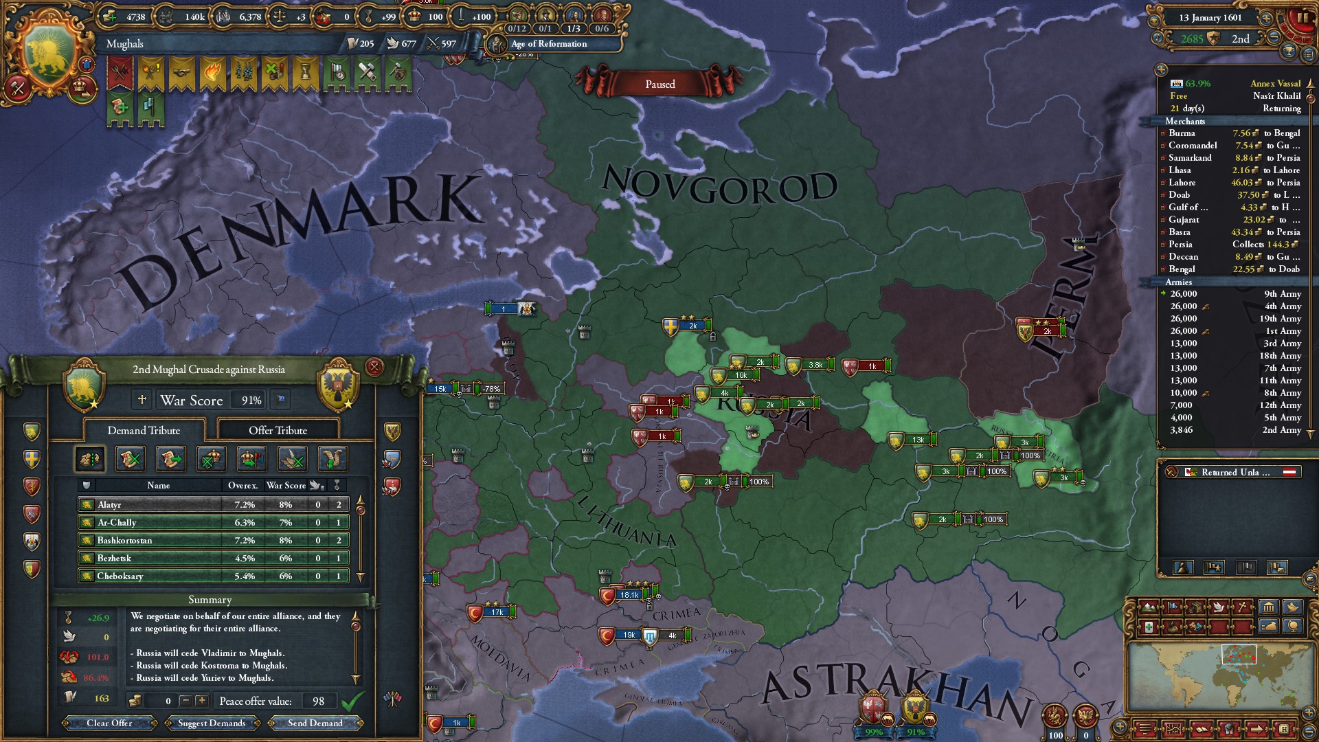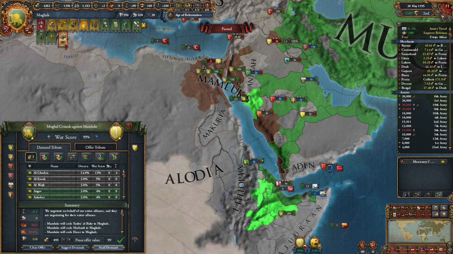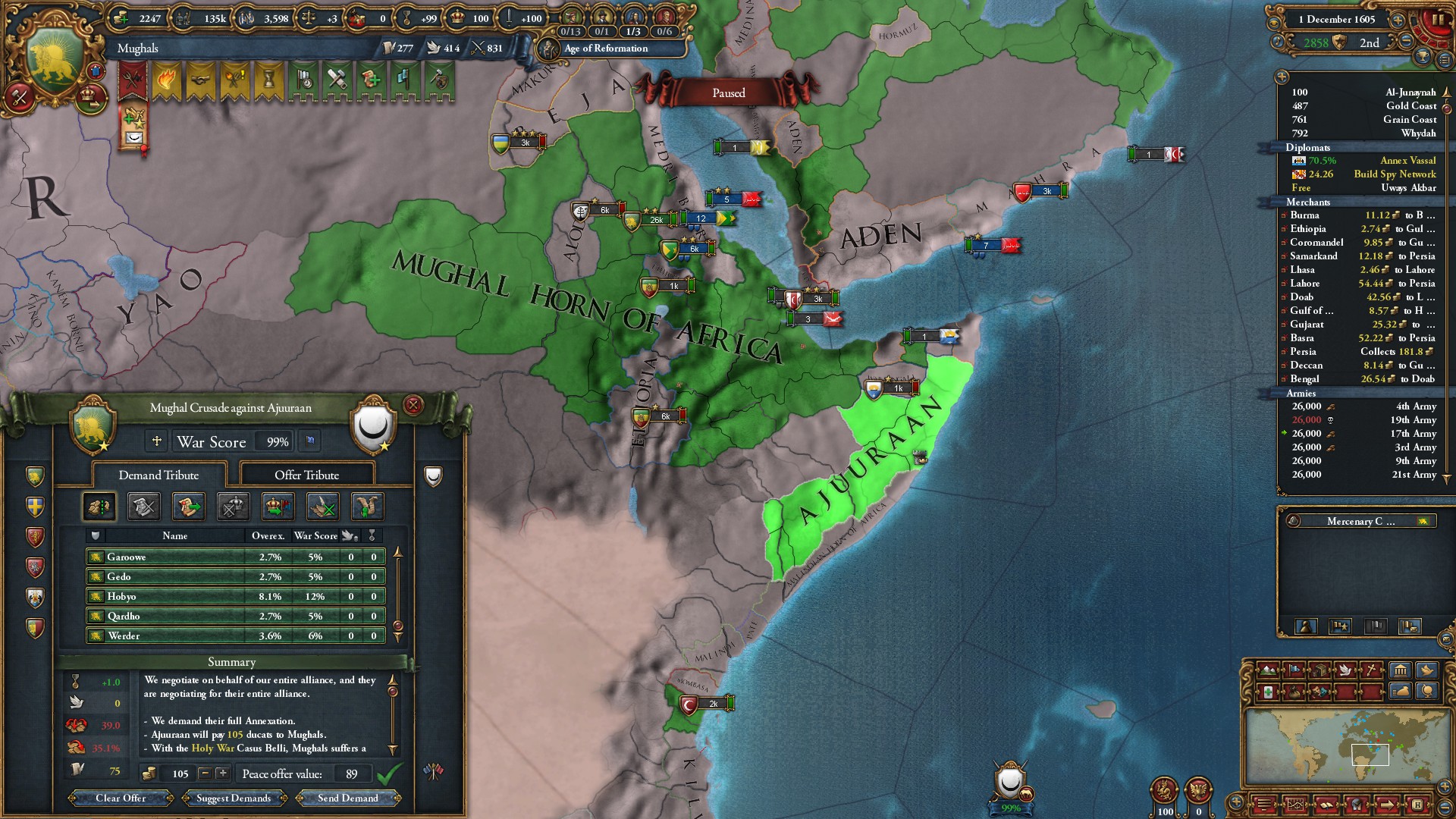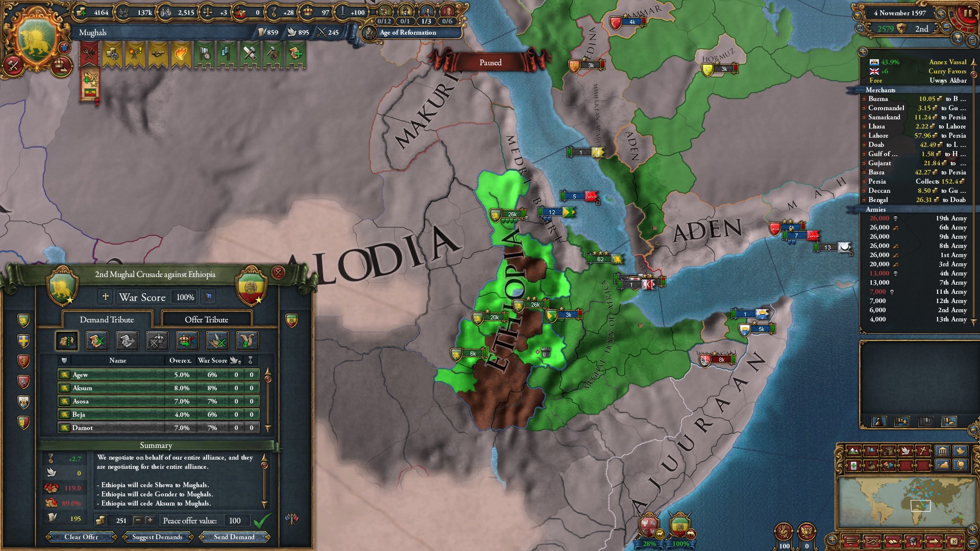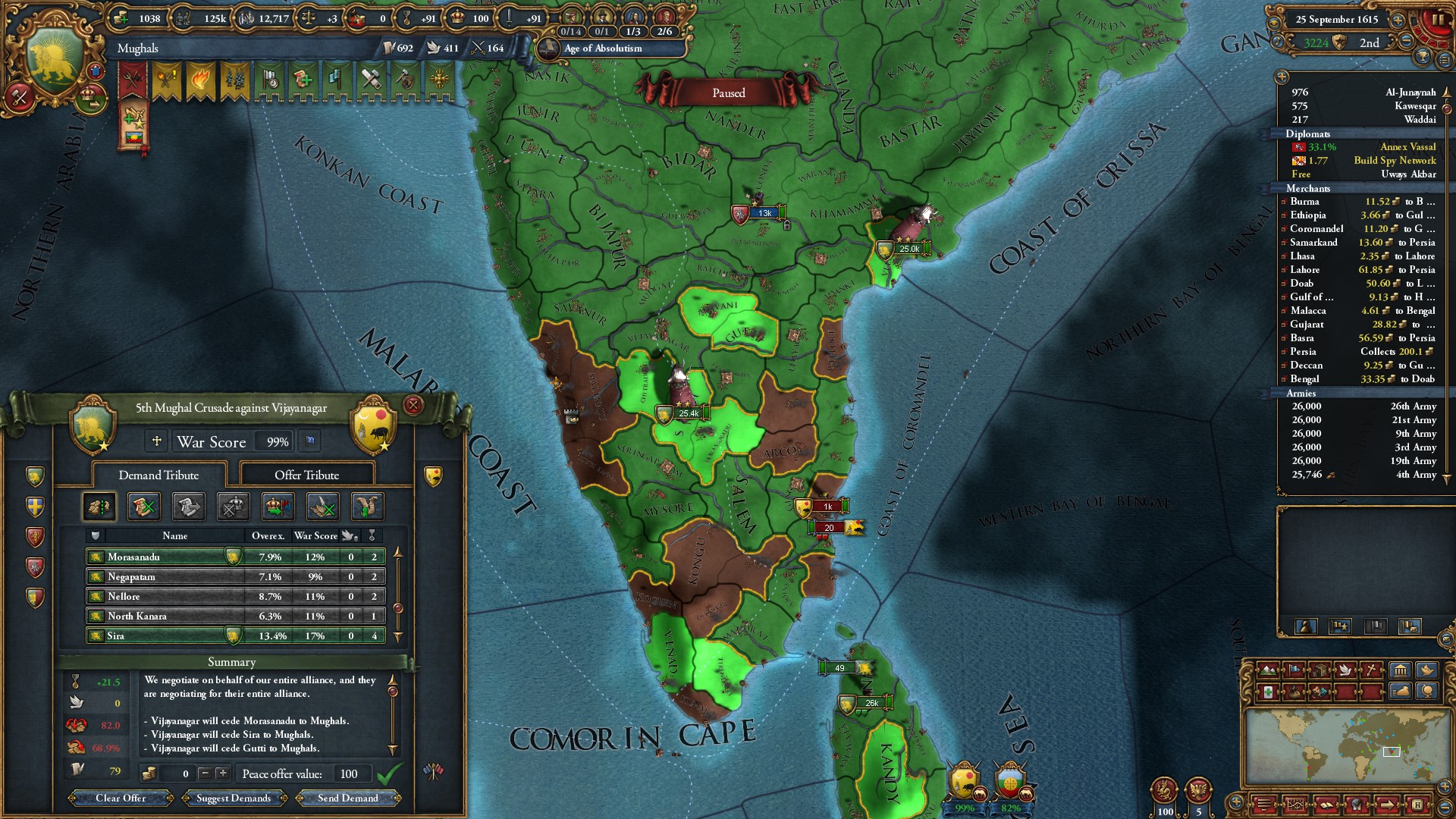 ヴィジャヤナガル戦終結。グジャラート文化を同化したことで陸軍損耗減少のボーナスを獲得しました。