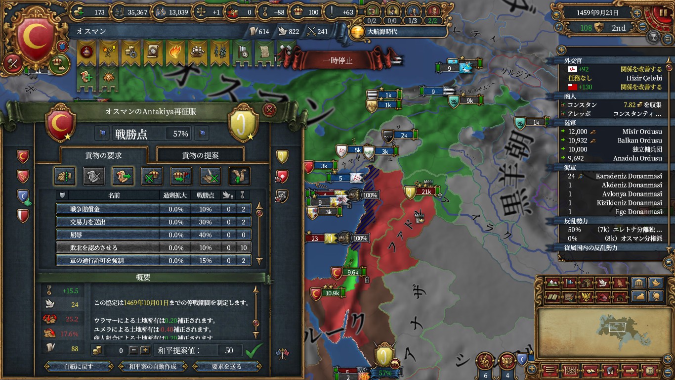 ミッション報酬で得たチュニスエヤレト化cbでチュニスエヤレト化後、アナトリアのアジア部分に遷都。交易首都はコンスタンティノープルノードに。