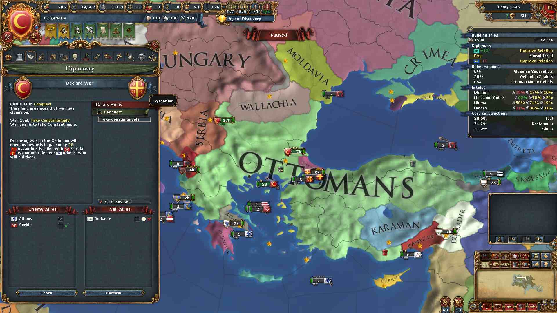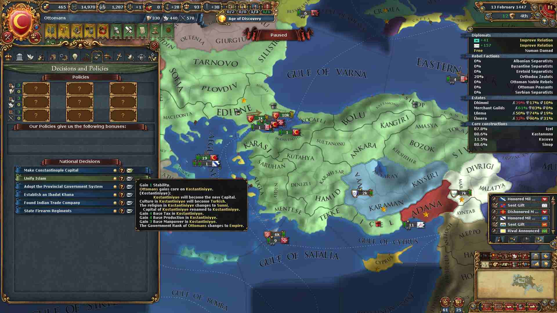 ディシジョンでオスマンの首都をコンスタンチノープルに移します。
