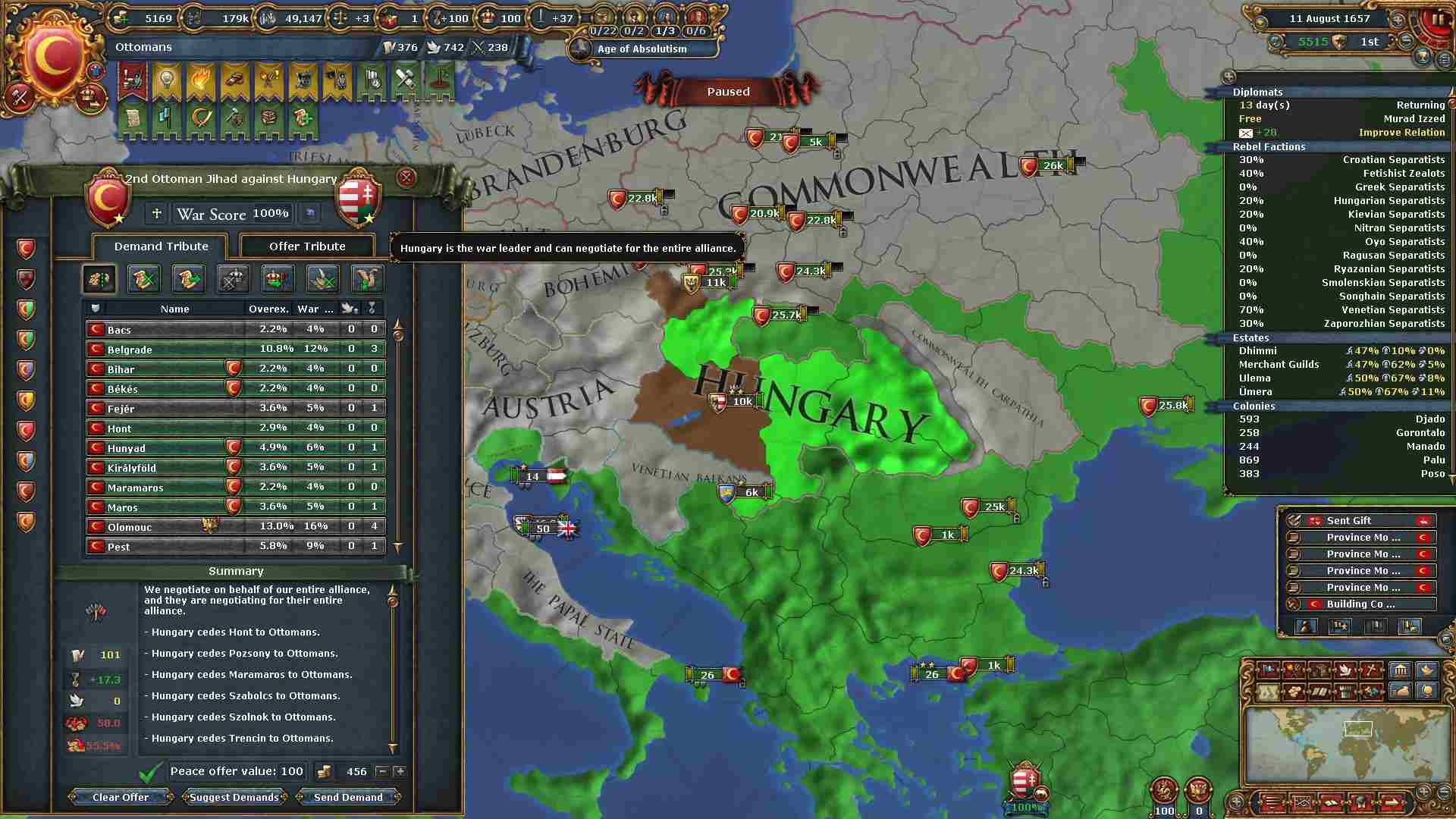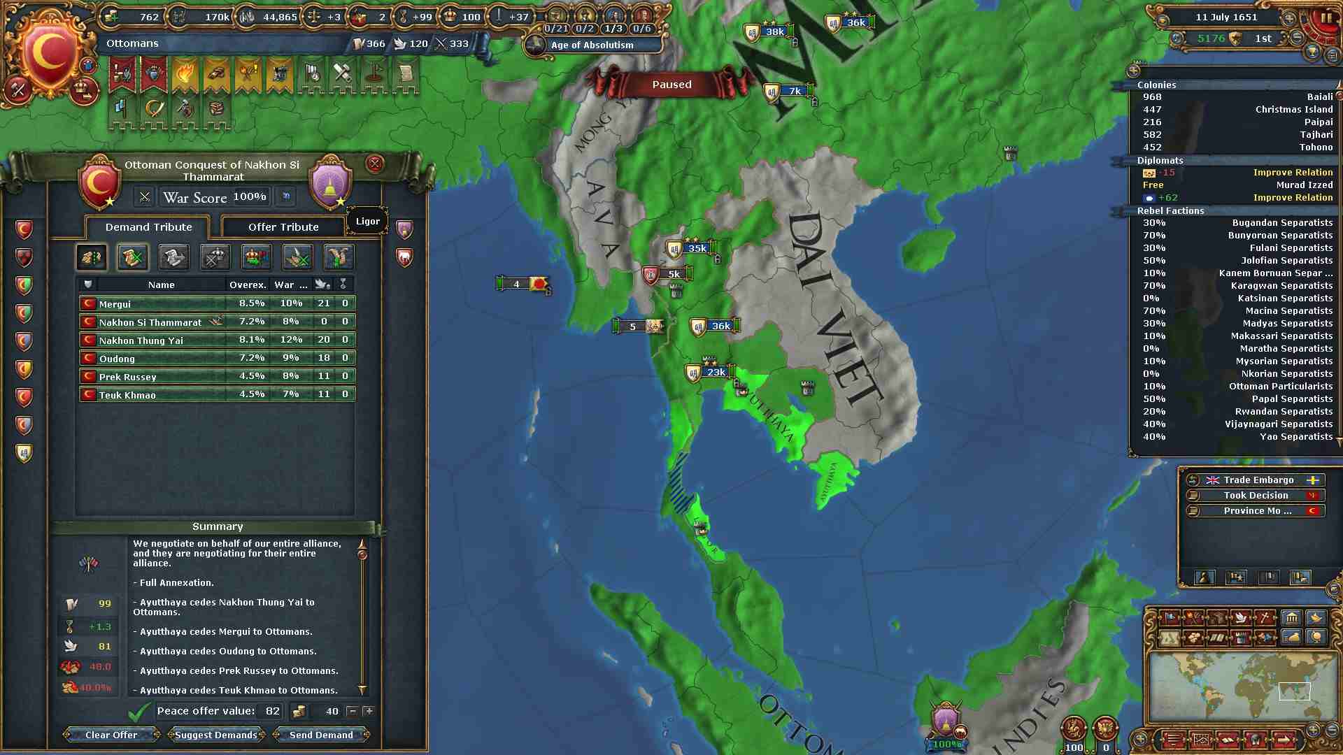 戦勝点一杯に領土及び賠償金を得ています。
