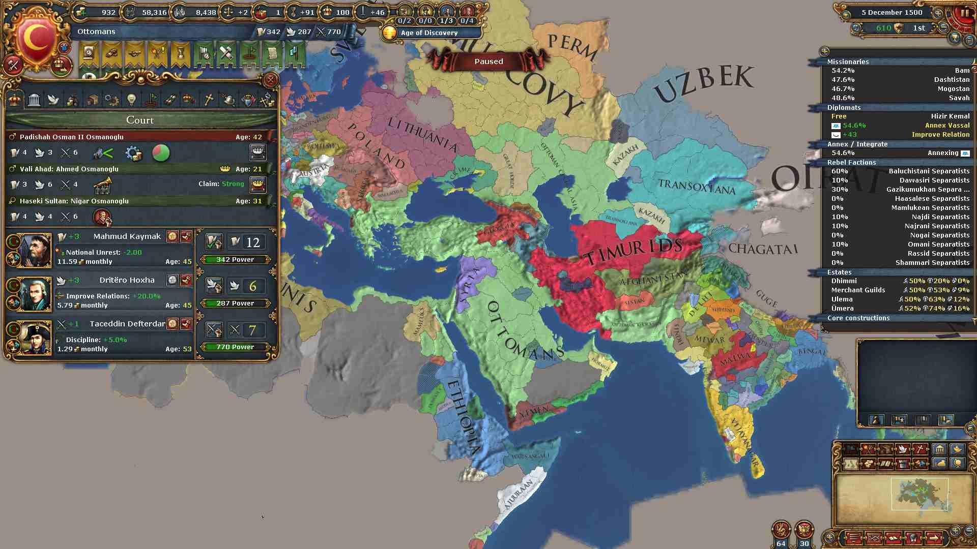 属国併合をすると外交評判が10年間-3されるので、前回の属国併合から10年経過してそのバフが取れるタイミングを見計らって次の属国併合を計画しています。