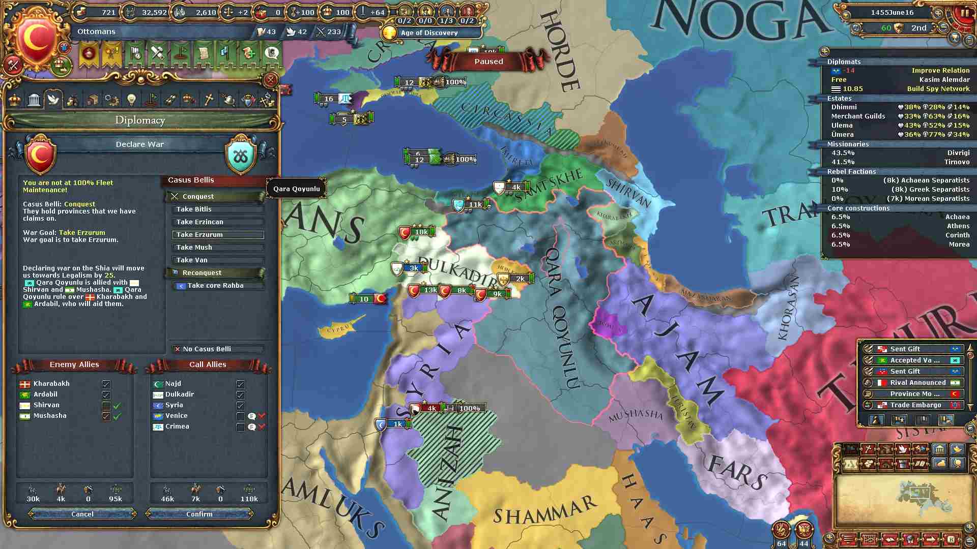 今回もスンニのままでOne Faithを目指しますので、まずは統一イスラムに必要な領土を獲得すべく動き出します。