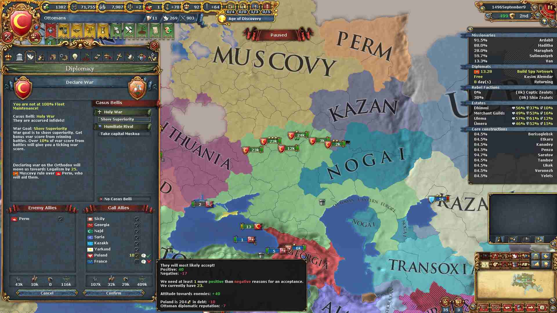 宗教アイデアをコンプし聖戦CBで攻め込みます。