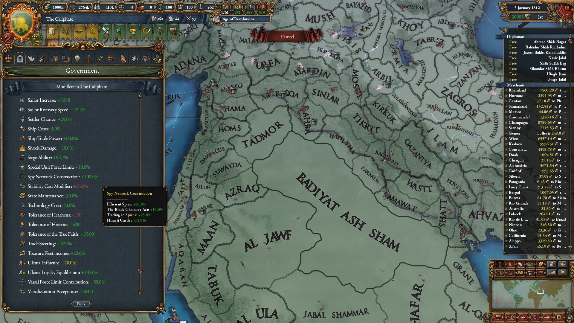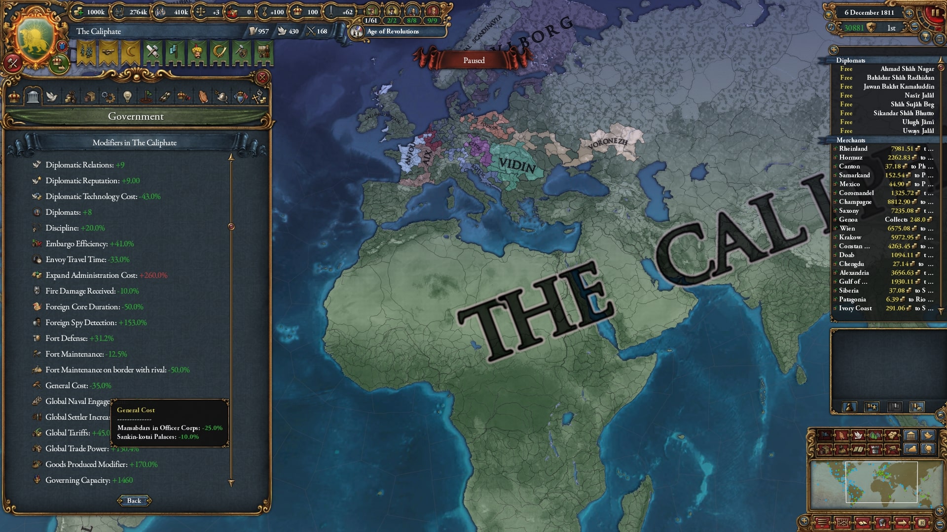 アイデア(Religious)+3、政体(Feudal Thocracy)+1、遺産+5(Ache、Tikrit)、顧問+2、