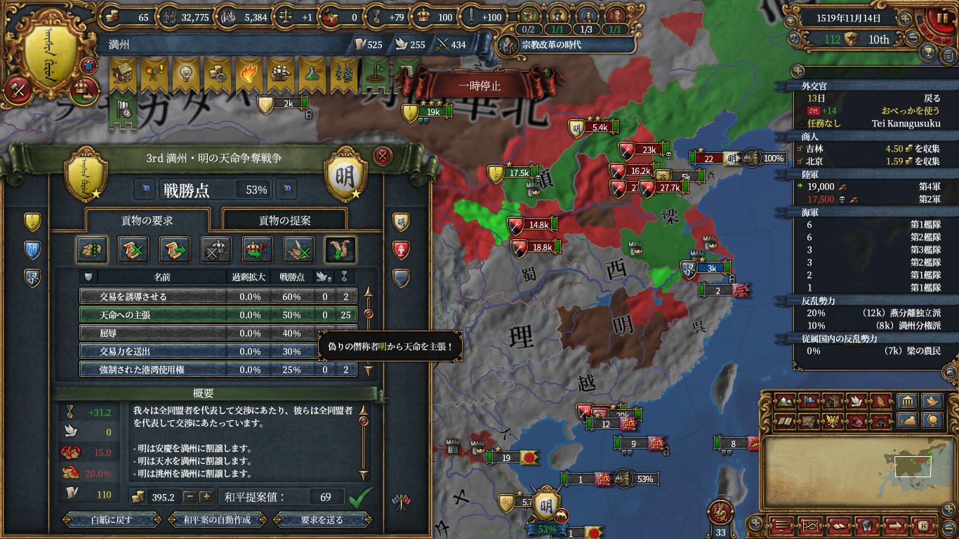 満洲に変態したのでミッションからドルゴンと軍質補正を受け取り、天命CBで明に宣戦。