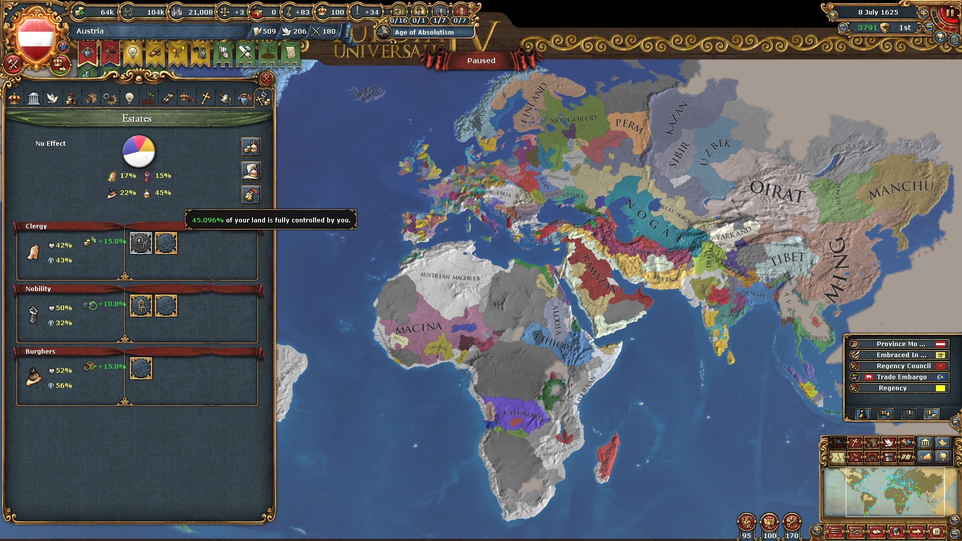 ファンネルプレイでは属国に領土をほとんど投げているので自治領の割合が低いままです。