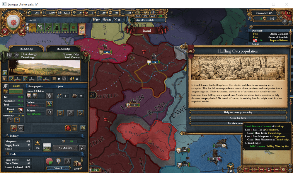 同年6月、領内のCoppertownにおいてHalfling種族が過密状態に陥っていることが判明、彼らの一部は隣接州であるThomsbridgeに移住しようとしていました。王国はこれを許可、この寛大な処置に、Halfling種族の寛容度が少し上昇しました。