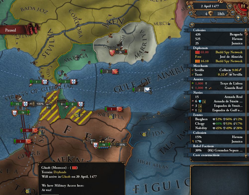 表示上はPortugal軍が15k・11kもいるように見えるが、その正体は海兵隊の1連隊×2にそれぞれAttach(合流?)してきたCastile軍 このおかげで部隊の大部分を占めるのはCastile軍にも関わらず、要塞陥落後や塗り絵の際に占領権はPortugalのものとなった (CastileはGranada領をVital_Intersetに設定していたので、Castile軍単独で塗り絵すると占領権はCastileに渡ってしまう)