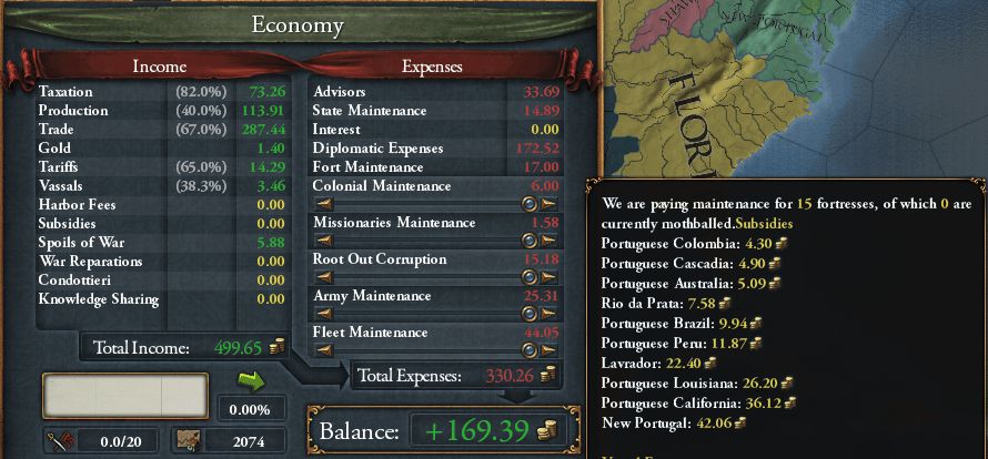 青が投資済み。人的資源はどうでもいいので、内陸部の貿易会社州には投資していない ポルトガル内陸部や植民地国家にLv6要塞を建築したのも合わせて、2万ducats以上を消費し国庫の残りは4000ducatsを切った