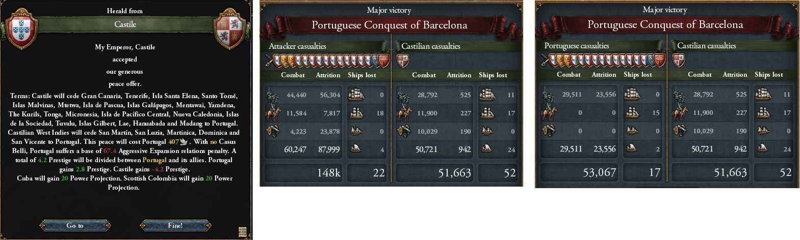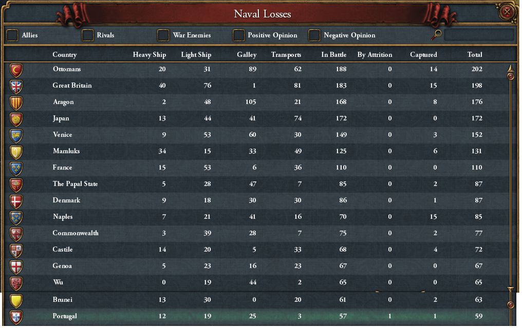こちらも想像よりずっと多かった。戦闘結果ではあまりマイナスがついていた記憶はないので、沈んだ隻数以上に拿捕していたのだろう 多いとは言えGreat_Britainの3分の1以下であり、逆に他国の沈んだ船について、Great_BritainやAragonの殆どとOttomansやJapanの半分くらいはPortugalによる戦果だと思う