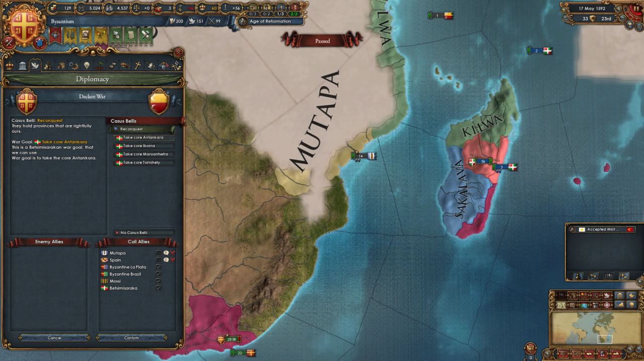 3プロビ奪って講和。Pateに隣接するプロビを奪って聖戦CBを使えるようにし、かつCoastal Center of TradeのZanzibarプロビンス(島。このSSだと若干分かりづらいが、132.jpgを見るとよくわかる)を奪います。